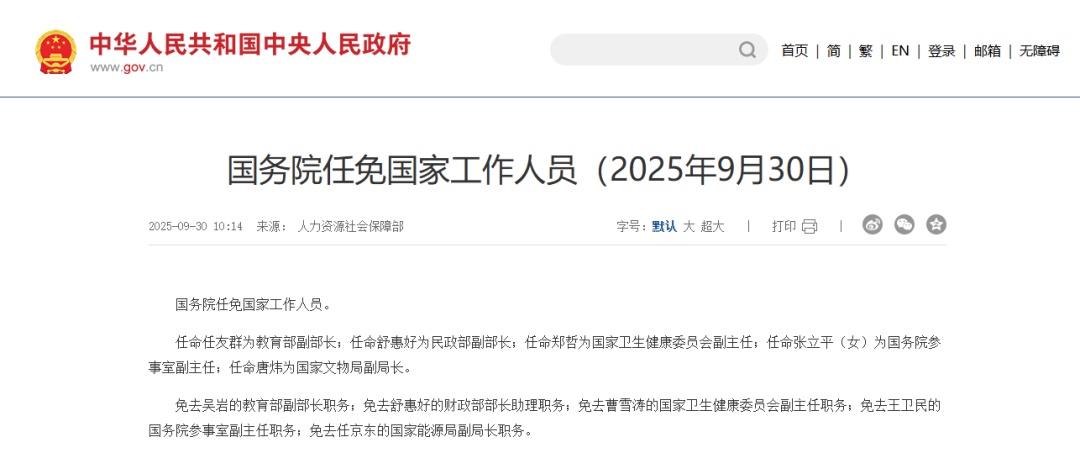 人社部网站发布消息显示,国务院还任命舒惠好为民政部副部长;任命郑哲为国家卫生健康委员会副主任;任命张立平(女)为国务院参事室副主任;任命唐炜为国家文物局副局长。