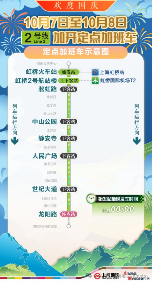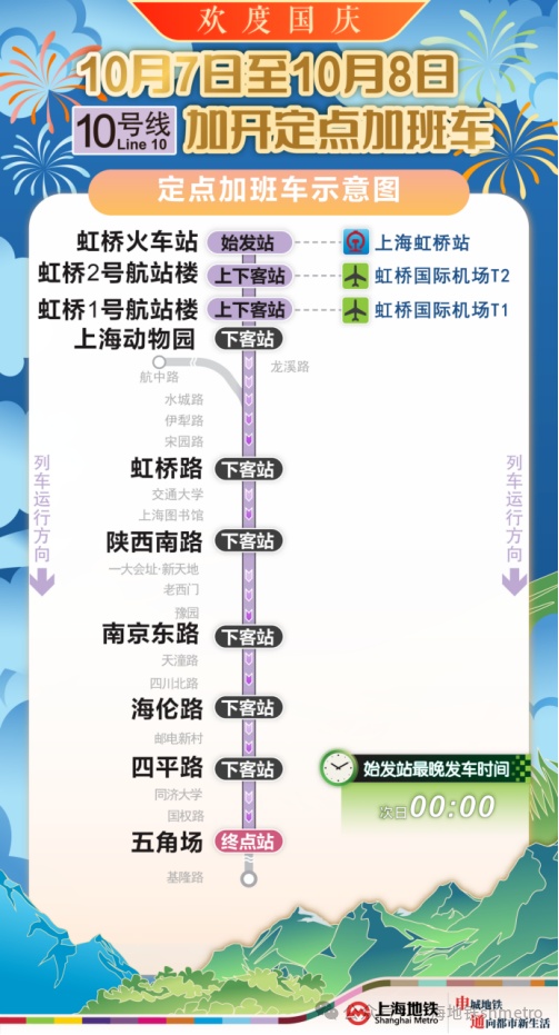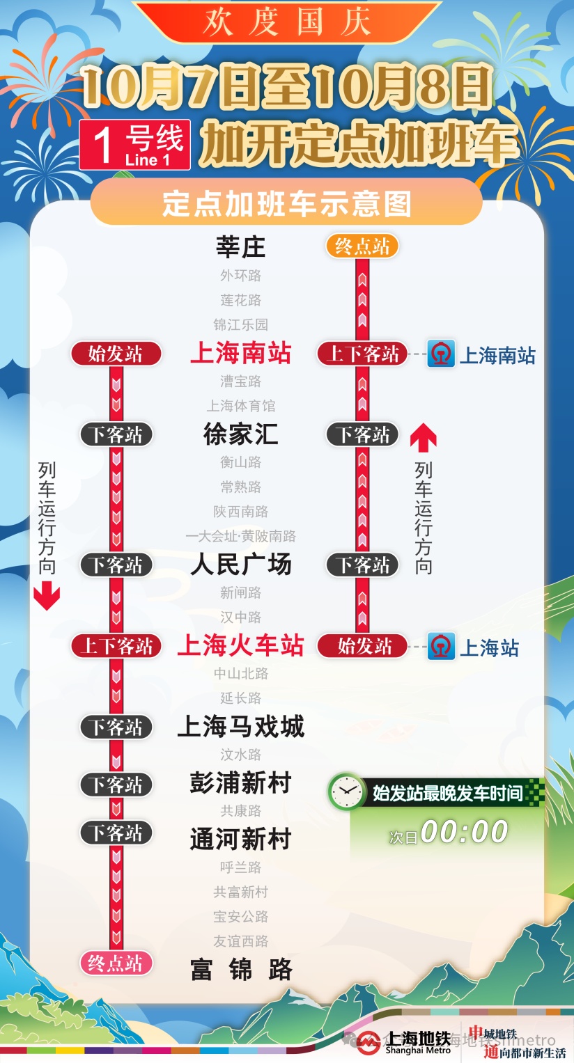 为提升国庆返程期间重要交通枢纽夜间疏散能力,根据计划,10月7日至10月8日,地铁1、2、10、17号线也将加开定点加班车,末班车发车时间延长至次日0点。同时,地铁运营方还将密切关注虹桥枢纽夜间客流情况,根据现场客流需求或将进一步延长定点加班车开行时间。