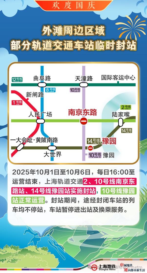 配合交通管制10月1日至10月6日每日16:00起 2、10号线南京东路站及14号线豫园站封站