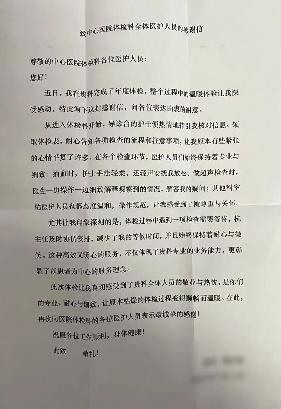 “抽血时,护士手法轻柔,还轻声安抚我放松;做超声检查时,医生一边操作一边细致解释观察到的情况,解答我的疑问;其他科室的医护人员也都态度温和,操作规范,让我感受到了被尊重与关怀。”杨先生在表扬信中写道:“这种高效又暖心的服务,不仅体现专业的业务能力,更彰显以患者为中心的服务理念。” 体检中心主任杭晓杰表示,这封表扬信既是对团队工作的鼓励,更是对区中心医院持续推进服务优化、践行人文关怀最好褒奖。 以暖心举措优化体验 用专业服务减少焦虑 为提升群众体检体验,减少等待过程中的焦虑感,区中心医院体检中心推出一系列暖心服务举措,致力于让每一位体检者感受到尊重与关怀: 专人引导,主动服务 在关键体检区域安排专人引导,工作人员文明用语、热情主动,及时解答疑问,确保动线清晰、流程顺畅。 1+X个性化套餐定制 根据体检者的年龄、性别、职业、健康状况及需求,提供“基础项目+个性化加项”的套餐定制服务,实现精准体检。 VIP贵宾体检服务 提供专人接待、全程陪同的一站式体检服务,为有特殊需求的人群提供更私密、高效的体检体验。 多科室协作快速通道 针对需要进一步检查或特殊需求的体检者,联合多科室开辟快速通道,减少等待时间,提升效率。 便民设施贴心准备 为行动不便者提供轮椅服务;设置专门休息室,为晕血、低血糖等人员准备糖果、温水等,及时缓解不适。 从“检得出”到“管得好” “检后延伸服务”实现健康闭环 除了体检过程中的贴心服务,体检中心还积极探索服务模式的创新。依托市六医院及本院专家团队资源,建立了“检后延伸服务”机制,为检出重大异常结果的体检者开辟绿色通道,直接对接临床专科,实现“筛查—诊断—治疗”一站式闭环管理,切实为百姓健康保驾护航。