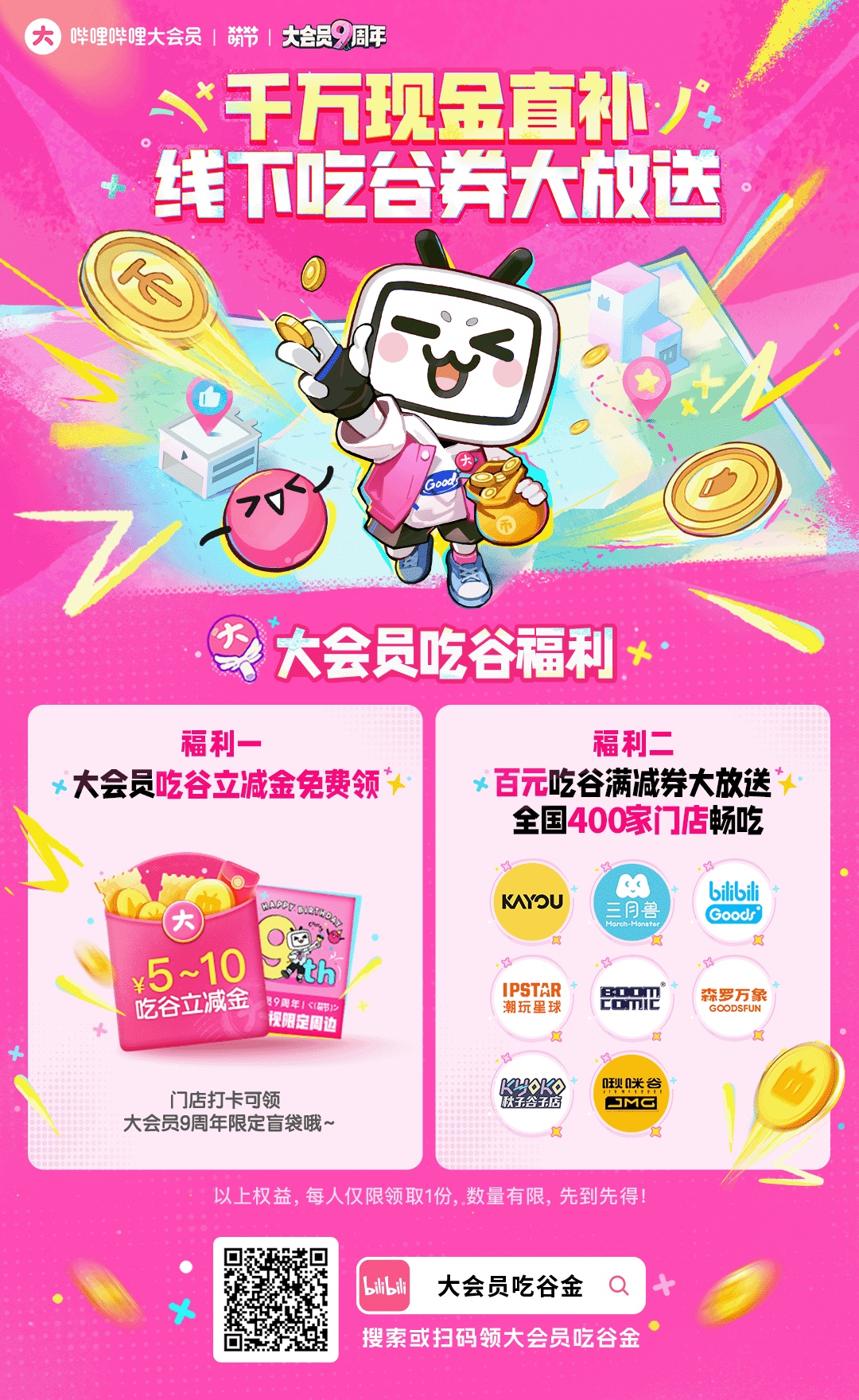 2025年大会员的九周年庆,不仅能享受“大会员庆生价”专属折扣,更带来超有惊喜的吃谷福利。千万现金直补,线下吃谷满减券免费领。合作品牌包含卡游、三月兽、bilibiliGoods、潮玩星球、暴蒙BOOMCOMIC、KYOKO秋子、森罗万象、啾咪谷等8个吃谷连锁品牌,覆盖全国127个城市,431家门店。