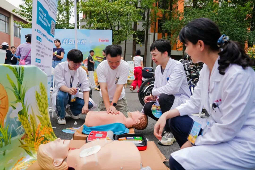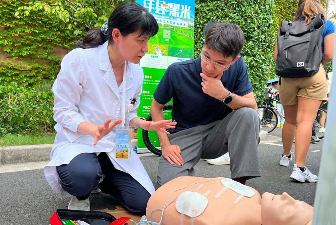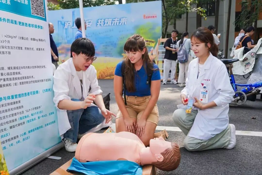 在充满朝气的大学校园里,青春的活力需要健康的体魄来承载。9月28日,同济大学附属同济医院体检与健康管理医学中心联合心血管内科,急诊内科携手上海崇明石榴籽公益发展中心,以“沪上粮安 共筑未来”为契机,将健康服务送进上海师范大学徐汇校区,为高校师生的健康保驾护航。 活动现场,我院医护团队聚焦师生健康需求,开展了模拟人AED心肺复苏实操教学。心血管内科来晏主任医师以全英文形式,为外国学生详细指导心肺复苏的抢救流程;急诊内科曾焕医生、董梓扬医生现场耐心指导师生们亲身实践急救技能,不仅让师生们掌握了关键时刻挽救生命的“法宝”,更提升了他们对健康急救的重视意识。同时,针对高校中日益凸显的肥胖及代谢综合征问题,健康管理医学中心副主任丁可可医生通过案例分享科学建议,向师生们传授健康饮食与生活方式的技能诀窍,从日常习惯入手,助力大家远离代谢类疾病困扰。为了鼓励师生们践行健康的生活方式,体检与健康管理医学中心的黎楠现场宣传公益直播二维码,贴心分发减重小礼物,包括跳绳、毛巾等,以实用福利鼓励大家践行科学减重、坚持运动健身。 无论是走进社区开展个性化减重指导,还是深入校园普及急救与健康知识,体检与管理医学中心都在以实际行动践行“同益济世 健康天下”的使命,未来将持续拓展健康服务边界,与更多机构携手,把专业的健康管理方案、实用的健康技能送到更多人群身边,为每一位追求健康的人筑牢健康防线,让青春因健康而精彩,让生活因健康而美好。