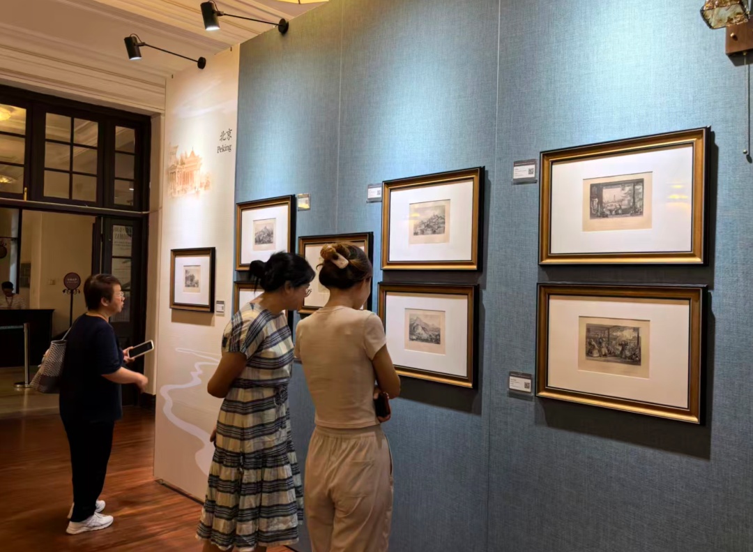 推开藏书楼厚重的木门,木质楼梯的吱呀声仿佛带你进入了时空隧道。展厅内,柔和的智能灯光洒在一幅幅铜版画上,19世纪中国的山川河流、城市街巷与民俗生活在画面中徐徐展开。南京琉璃塔的飞檐翘角细节清晰,街头剃头摊的人物神态生动,戏台前观演的人群错落有致——这些作品均出自阿罗姆为1843年书籍《中华帝国:古老的风光、建筑和习俗》创作的插画,虽历经近200年,色调依旧柔和,层次依然丰富。