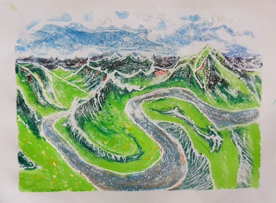 在美术教育领域,交流团的美术老师们则带来了富有创意与趣味的版画课程。他们不仅向当地美术教师传授了版画知识、工具使用、黑白及套色版画创作等课程,助力当地教学能力提升,更亲自指导学生,将久治女儿湾的自然风光、传统文化中广受欢迎的哪吒形象以及当下时尚热门的素巧妙融合,创作出一系列独具地方特色又充满时代气息的版画作品。这些生动有趣的作品,极大地激发了学生的创作热情,获得了久治师生的一致好评与喜爱。