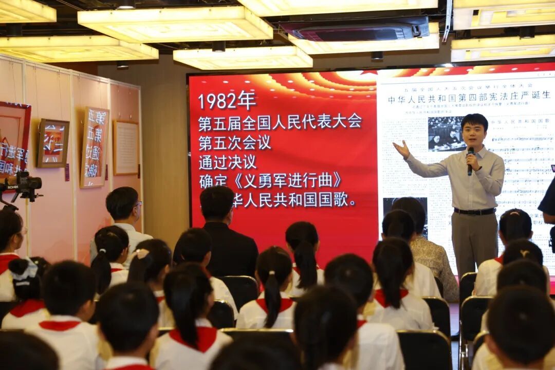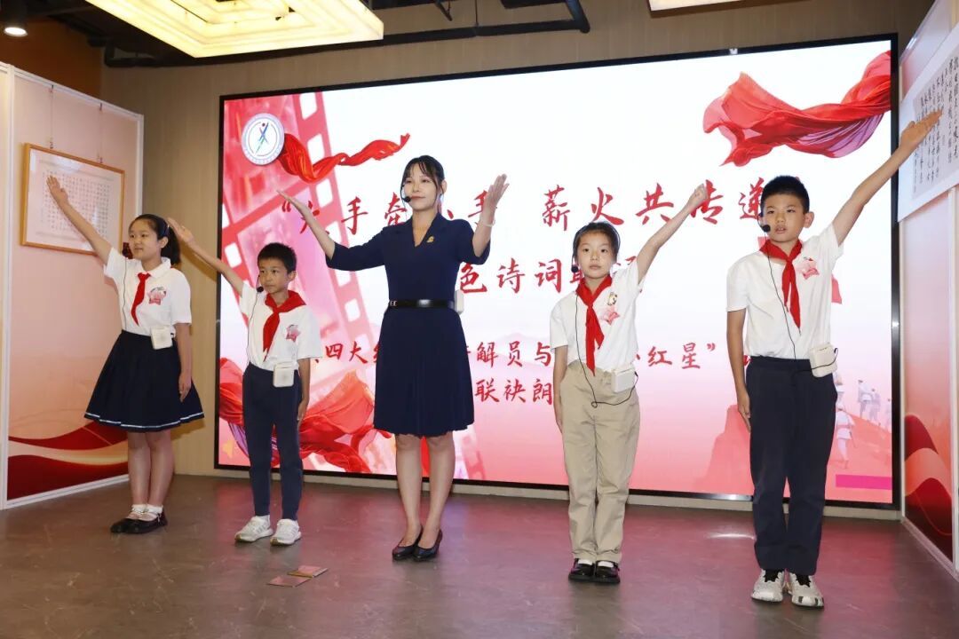 孩子们进入“初心讲堂”,红色故事与精神传承在此深度交融。“大手牵小手、薪火共传递”中共四大纪念馆讲解员孙露依与“小萝卜头”宋振中烈士生平展厅“小红星”讲解员代表,联袂带来红色诗词联诵,展现“老带新”的薪火接力;讲解员陈诚以《义勇军进行曲》为切入点,生动讲述“中华民族到了最危险的时候”的历史背景,解读中共四大在抗战时期作为“团结纽带”的重要作用,让同学们在故事中触摸先烈的赤诚与担当。