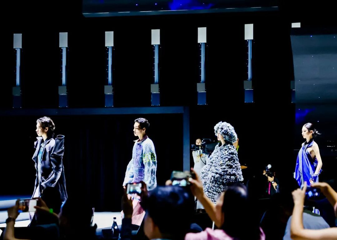 “镜・界”超时尚秀以《镜・像》《梦・域》《光・耀》三幕展开,60套作品均出自东华新锐设计师与优秀毕业生之手。其中《镜・像》系列以创新构成为核心,不对称斗篷上的镜面镶嵌使光线无限折射,既呼应“以史为鉴”的哲学思想,又融入上海“海派文化”的精致韵味。舞台背景中,广富林文化遗址的数字影像缓缓流动,让观众真切触摸到“上海之根”的厚重历史。值得一提的是,秀演音乐皆为东华学子原创,为“海派时尚”赋予了专属的动人旋律。