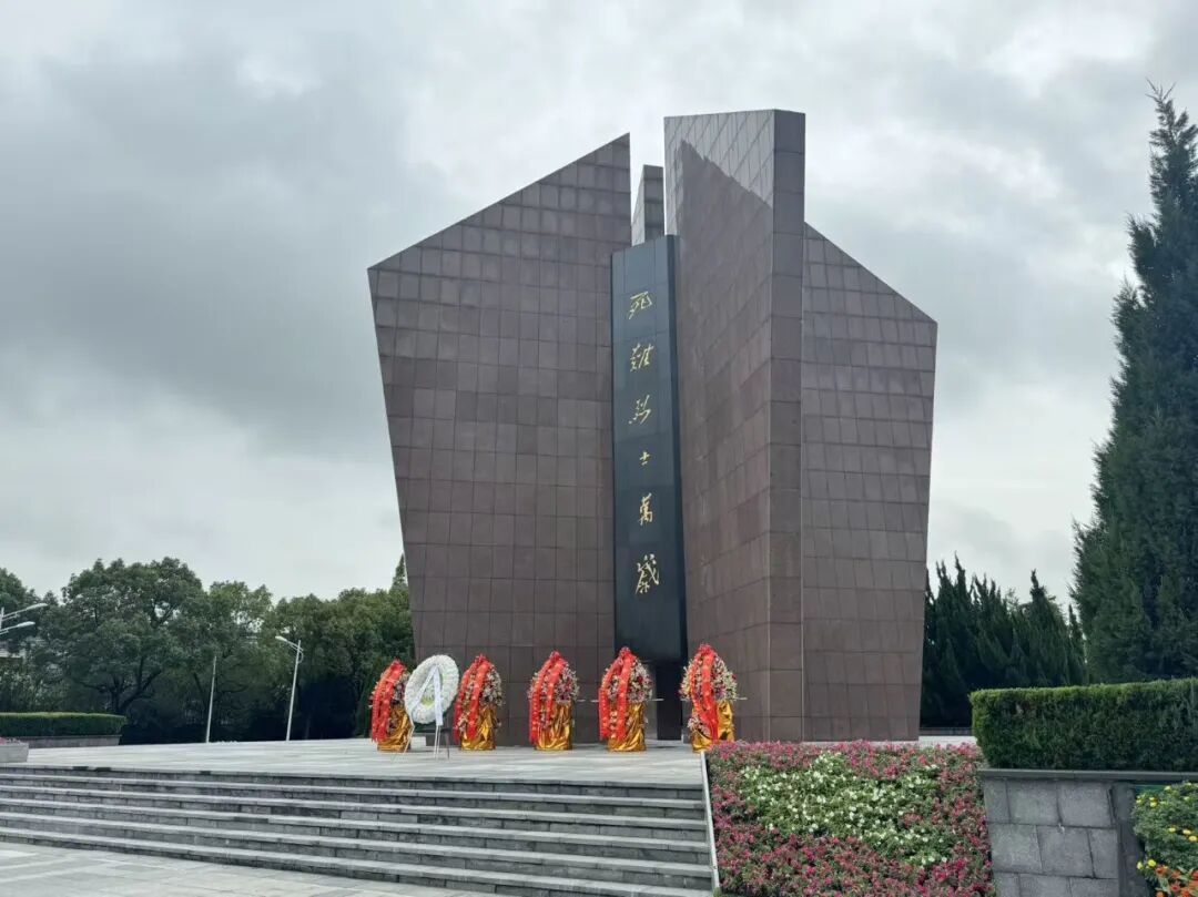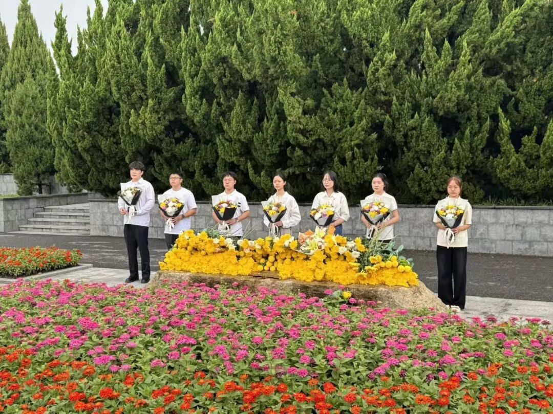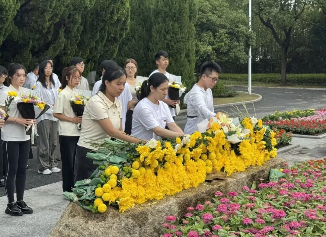 下午1时,高大的革命烈士纪念碑巍然耸立,陵园内松柏静默。六十余位来自上海工程技术大学的师生手持花束、身着素装,在墓区前整齐列队,向为国家和民族献出生命的英烈们深深鞠躬。