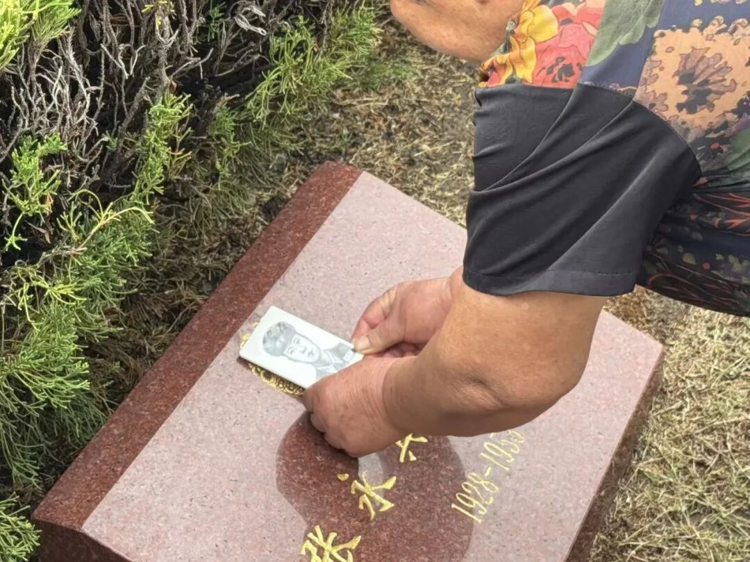 在两座没有相片的墓碑前,烈士赵小云、张永其的家属手捧黑白画像,认真擦拭碑体,随后小心翼翼地将画像端正地贴合在墓碑上方。赵小云烈士的儿子赵进才老人说,父亲牺牲时他仅3岁,今日得见父亲容貌,内心感慨万千。张永其烈士的孙子金雪平携母亲一同前来,两人将碑前的画像擦拭了一遍又一遍。“爷爷去世时,仅寄回家一封信与一张照片,由于年份已久,照片早已损坏。”金雪平说,“时隔多年,再次见到爷爷的画像,太感谢了。”