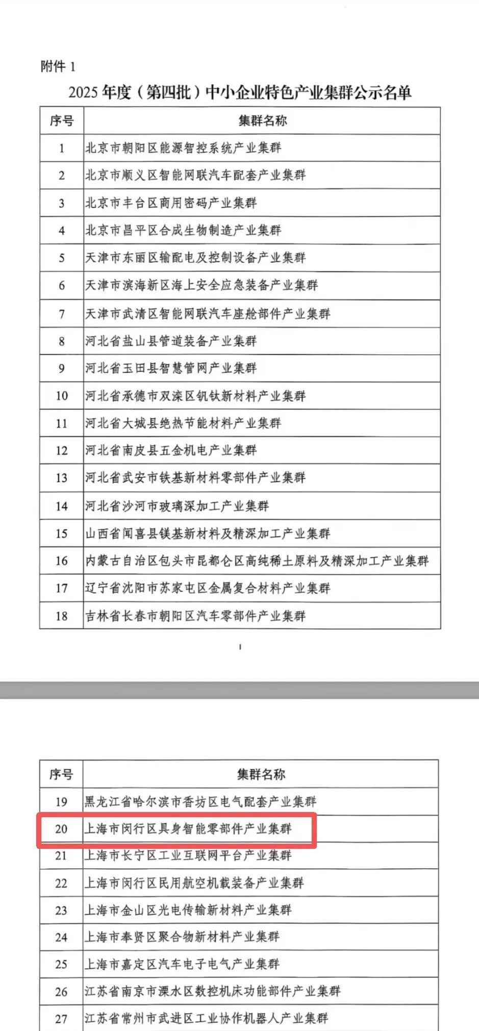 近日,工业和信息化部公布2025年度国家级中小企业特色产业集群名单,来自上海马桥人工智能创新试验区(简称“试验区”)的“上海市闵行区具身智能零部件产业集群”成功入选,成为全国仅有的两个以“具身智能”为核心方向的国家级产业集群之一。这一重要突破,标志着试验区在人工智能产业领域的前瞻布局和系统实践获得国家层面的高度认可,也为上海打造国际人工智能高地注入了新的战略动能。