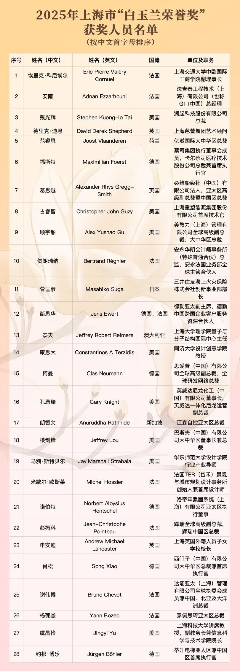 上海市政府自1989年起设立并形成以白玉兰为名的常设性系列综合奖项,以表彰和感谢杰出外籍人士为上海经济建设、社会发展和对外交往作出的积极贡献。古睿智曾于2023年获“白玉兰纪念奖”,此次再获“白玉兰荣誉奖”,是对其长期深耕氢能领域所作贡献的充分肯定。