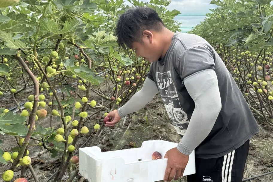附近镇上居民区的“团长”来到种植基地,搬运订购的无花果。“每到成熟季,我们就来这里团购无花果。基本上开一次团会有20篮—50篮的团购量,复购率也很高。”