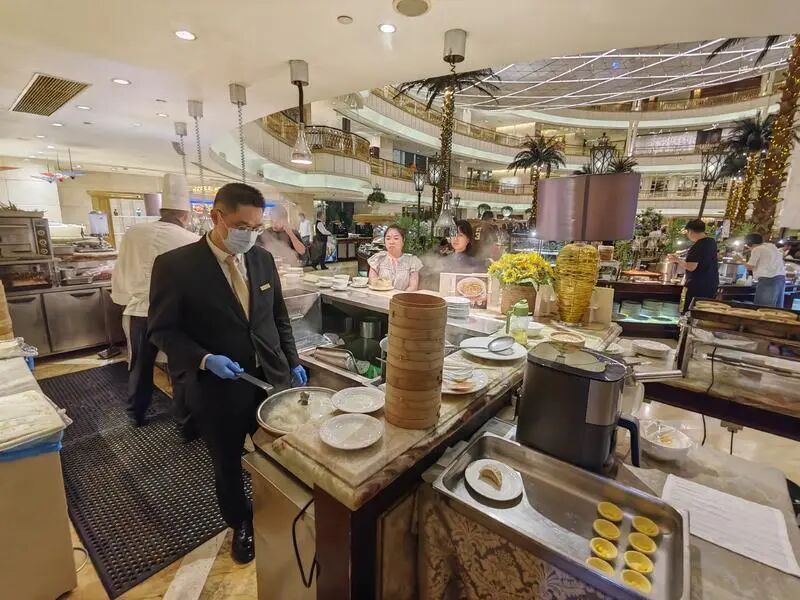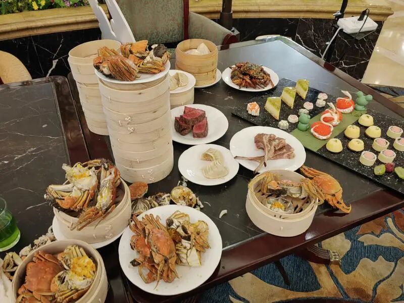 在现场记者看到,大厅内座无虚席,餐桌上大闸蟹无限自取更是让饕客过足了瘾。不少食客告诉记者,这里的大闸蟹正宗,质量好,性价比高。除了大闸蟹,还有不少蟹菜蟹点,还有羊排、牛排等特色菜肴以及中西点等。