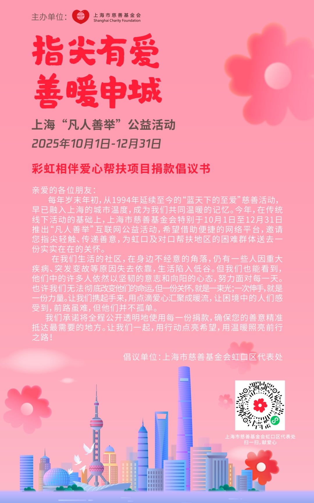 指尖有爱,善暖申城。2025上海“凡人善举”互联网公益活动10月1日起正式拉开帷幕,并持续开展至12月31日。本次活动将继续拓展“互联网+慈善”的创新模式,依托互联网公益平台,切实提升公益组织数字化能力,弘扬上海城市慈善文化,助力上海地区公益生态的建设与发展,营造健康公益的良好氛围。 多年来,在社会各界的支持下,虹口区“蓝天下的至爱”系列慈善活动已经成为深受民众认可的品牌,是全区捐赠善款,奉献爱心的重要平台,为许多需要帮助的人提供了慈善帮扶,传递了慈善的关怀和社会的温暖,成了展示虹口区人文关怀精神的一张名片。 彩虹相伴爱心帮扶项目计划聚焦困难群体的“急难愁盼”问题,切实回应困难家庭需求,重点关注遭遇突发性、紧迫性、临时性基本生活困难的老年人、未成年人、残疾人和重病患者等弱势群体,为其生活帮扶、教育支持、心理关怀等服务,提升其生活质量和发展能力,让他们感受到社会的关爱。项目涵盖安老、扶幼、助学、济困、乡村振兴、慈善公益多个领域。