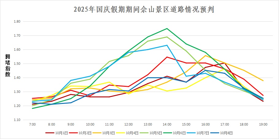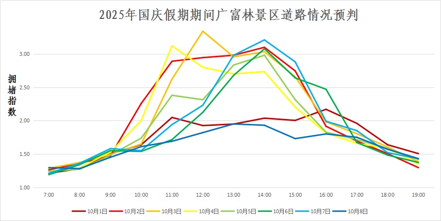 据统计,2024年国庆假期期间(10月1日—10月7日),松江热门景点佘山国家森林公园、月湖雕塑公园、欢乐谷、辰山植物园和广富林文化遗址公园共接待游客34万余人次,日均接待游客4.8万余人次;共接收车辆4.5万余辆次,日均接收车辆6.4千余辆次。 ▲2025年国庆假期期间 广富林景区道路情况预判 ▲2025年国庆假期期间 佘山景区道路情况预判 从单日分时流量来看,预计假期期间,每日11时至13时为入景区客流高峰,车辆骤增,道路通行速度减慢;14时至16时为景区游客集中返程时段,车辆集中驶离景区给道路交通带来压力。 预计今年国庆、中秋假期,松江各景区客流将明显上升,因此停车资源更加紧张,所以建议至松江景区游玩的市民绿色出行,自驾市民请提前规划出行线路和时间,错峰出行。
