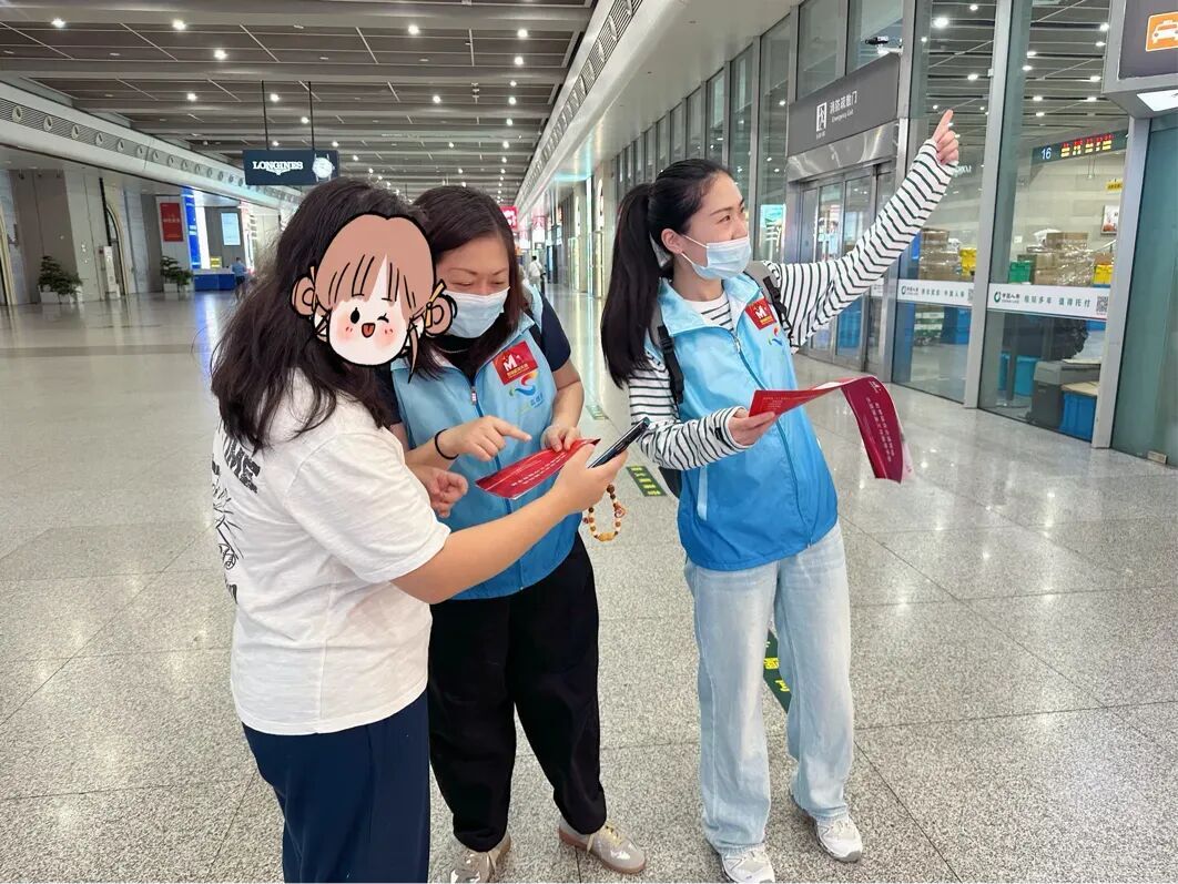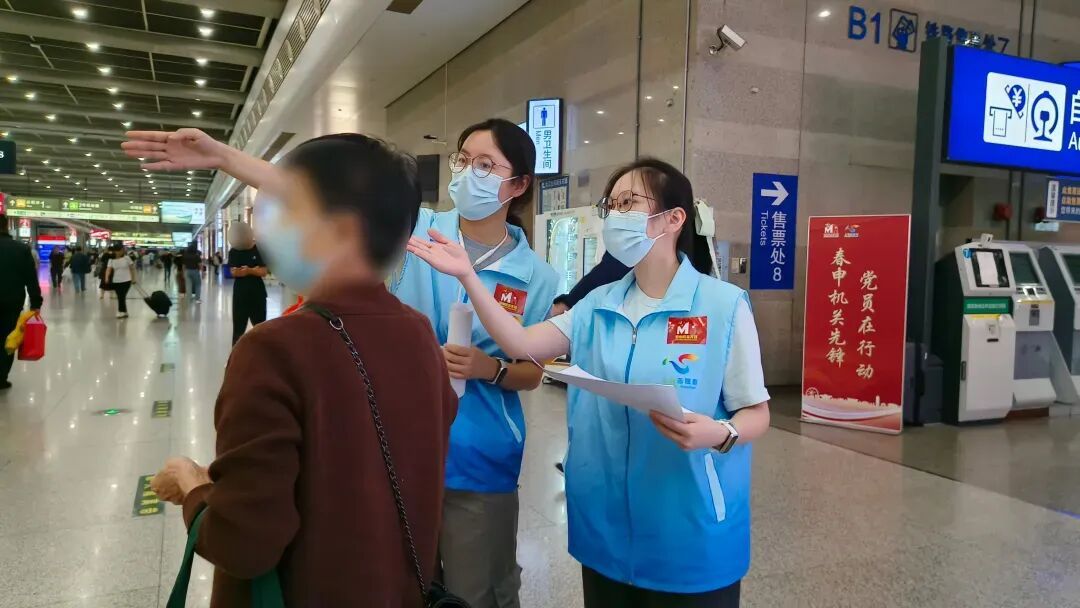 人流如织的枢纽大厅里,一位老奶奶攥着车票,神情茫然。见此情况,七宝社区卫生服务中心的陈政怡和虹桥社区卫生服务中心的唐千喜快步上前,轻声询问:“奶奶,您有什么需要帮忙的吗?”了解到老奶奶是迷路了后,她们一人展开地图,细致讲解路线;一人标注关键标识,担心老人记不清,还特意写了一张小纸条,把地铁站点、出口信息写得清清楚楚。这一刻,志愿者不仅是方向的指引者,更是心安的守护者。