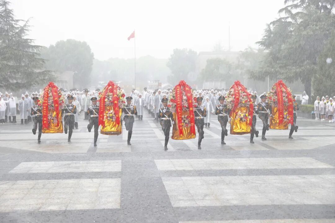 在深沉的《烈士纪念日号角》声中,王华杰、王靖、赵汝青、刘其龙等领导缓步来到悼念广场,在纪念碑前垂手肃立。