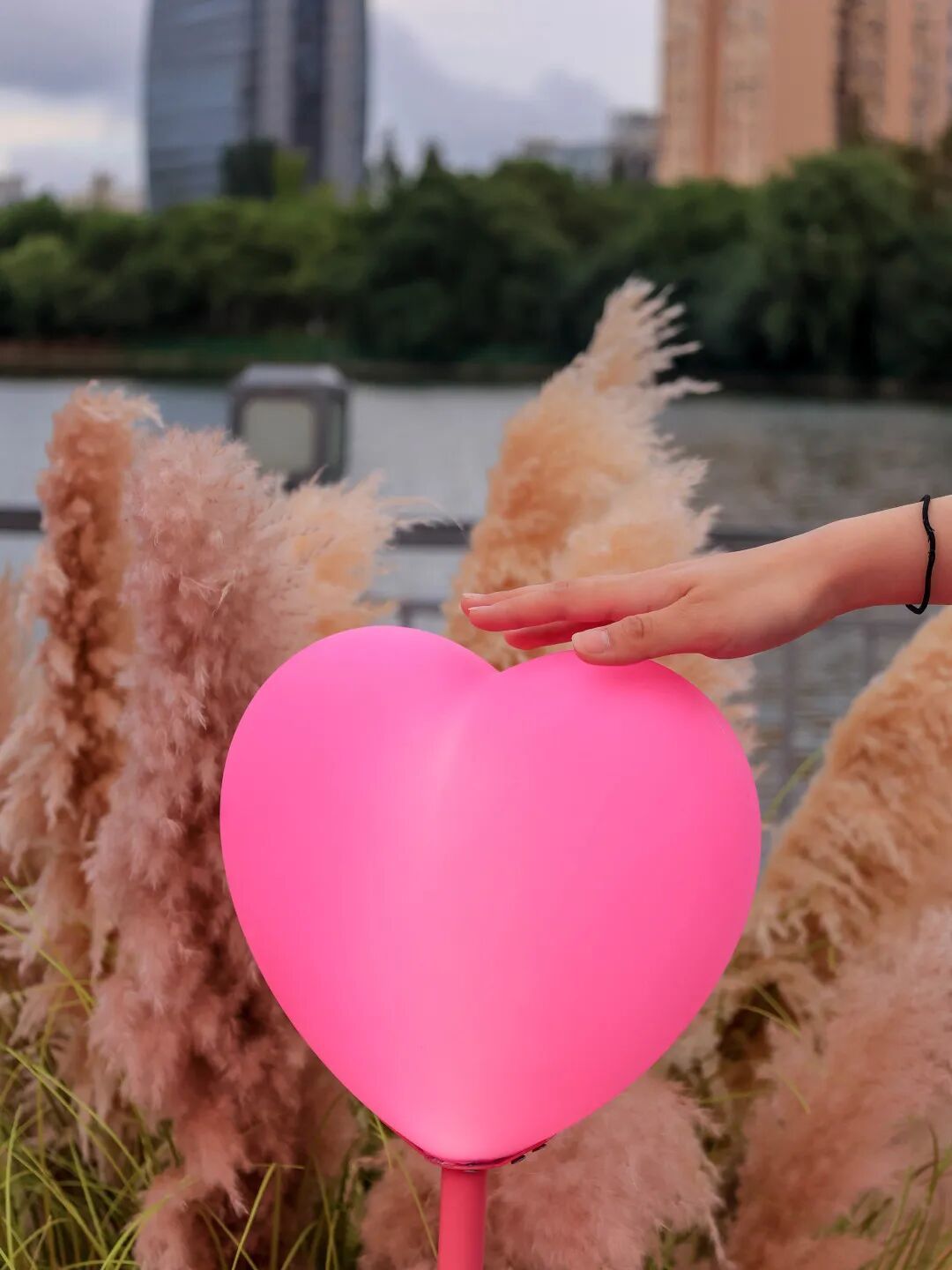 在湖畔大草坪,五个憨态可掬的“胖宝宝”气模吸引了不少居民拍照合影,不远处的爱心灯光互动装置,闪烁着梦幻的粉色光影,氛围感十足。