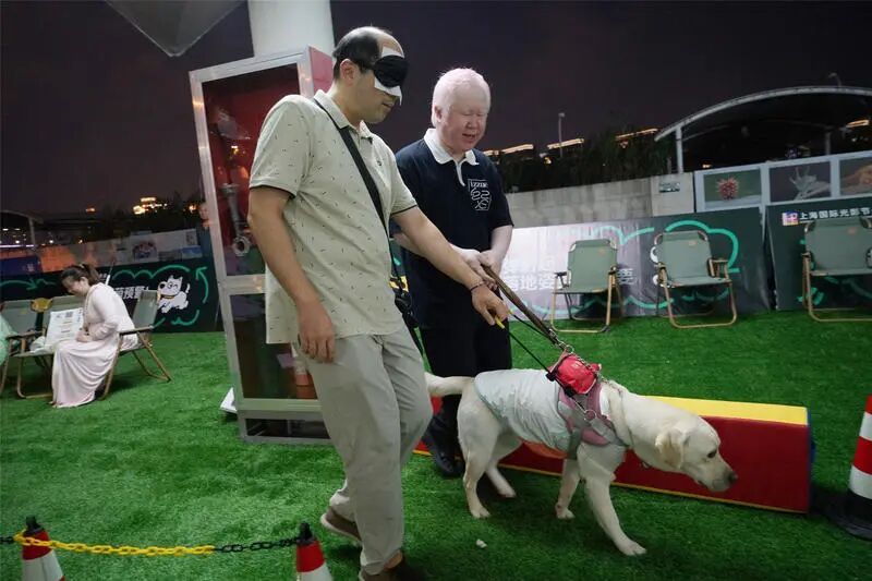“萌宠乐园”里,“毛孩子”们在徐徐江风下开心地奔跑,导盲犬模拟着工作的场景。