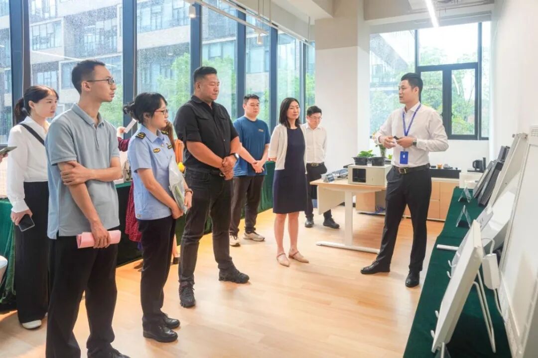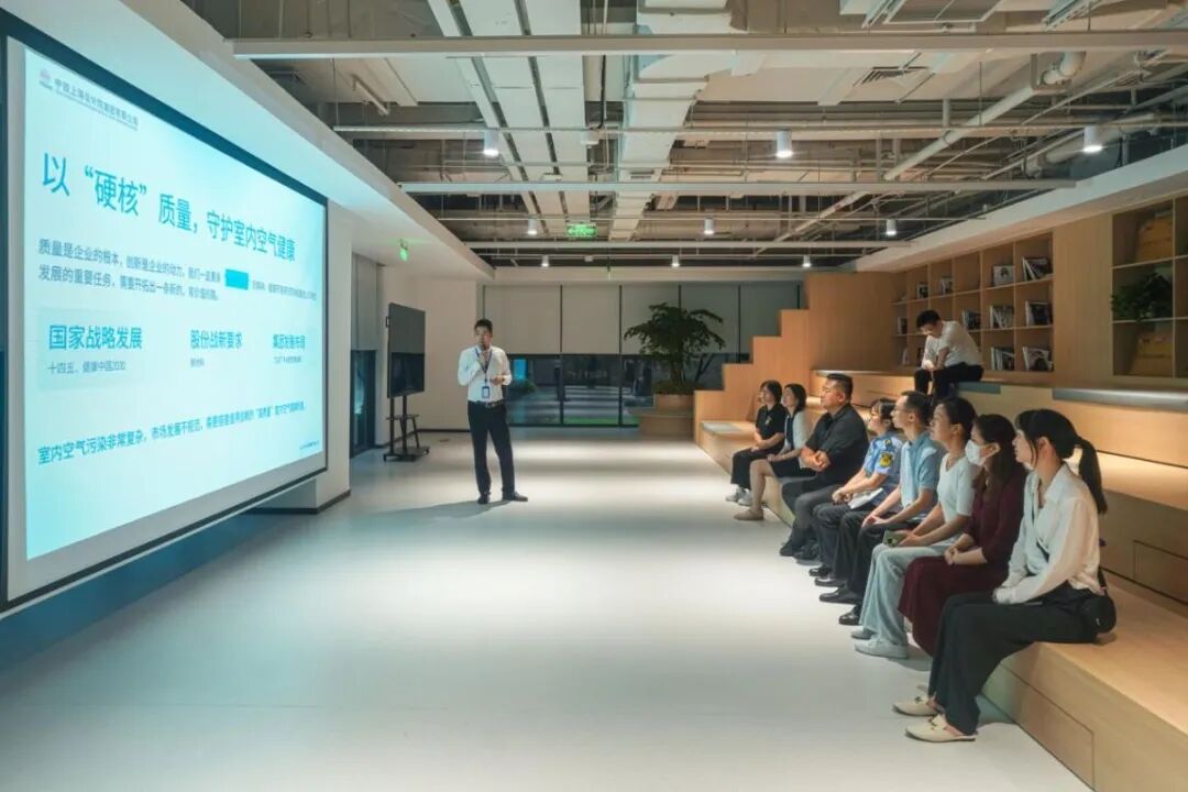 座谈结束后,一行人参观了中铁上海设计院集团有限公司在“美创静界”的企业展馆。在展馆内,大家深入了解企业研发的高科技技术理念及相关产品,实地考察能量小屋及室内健康环境系列产品,进一步深化了对绿色材料应用与可持续发展理念的认识,为后续企业开展绿色化、高质量发展提供了新思路。