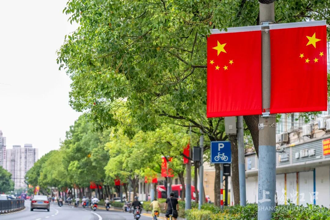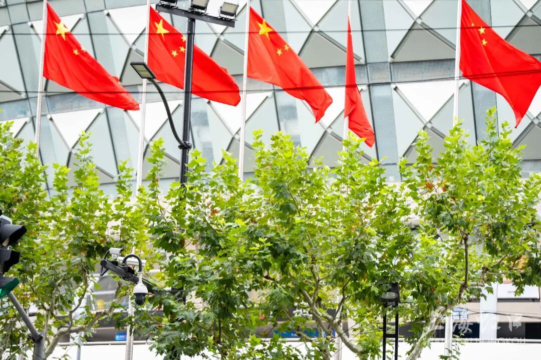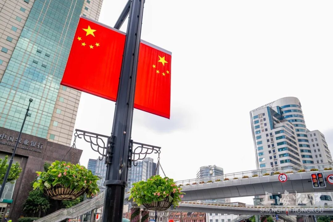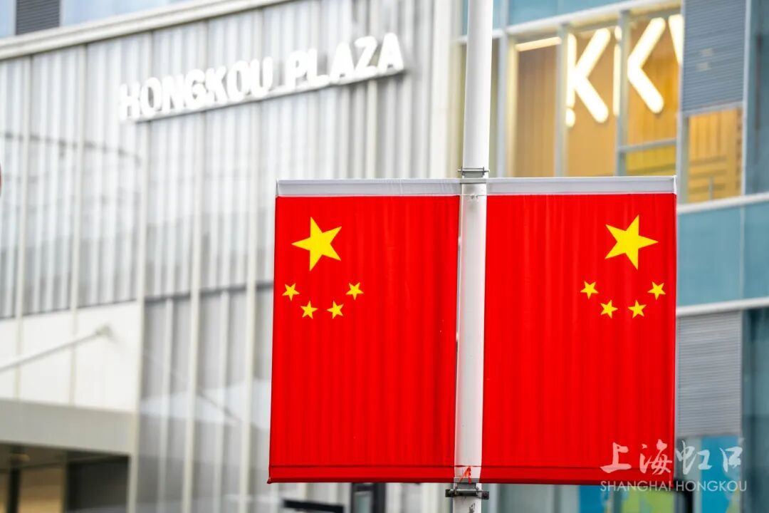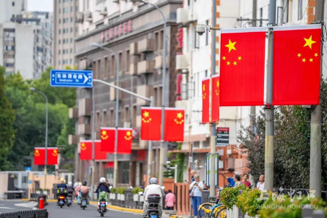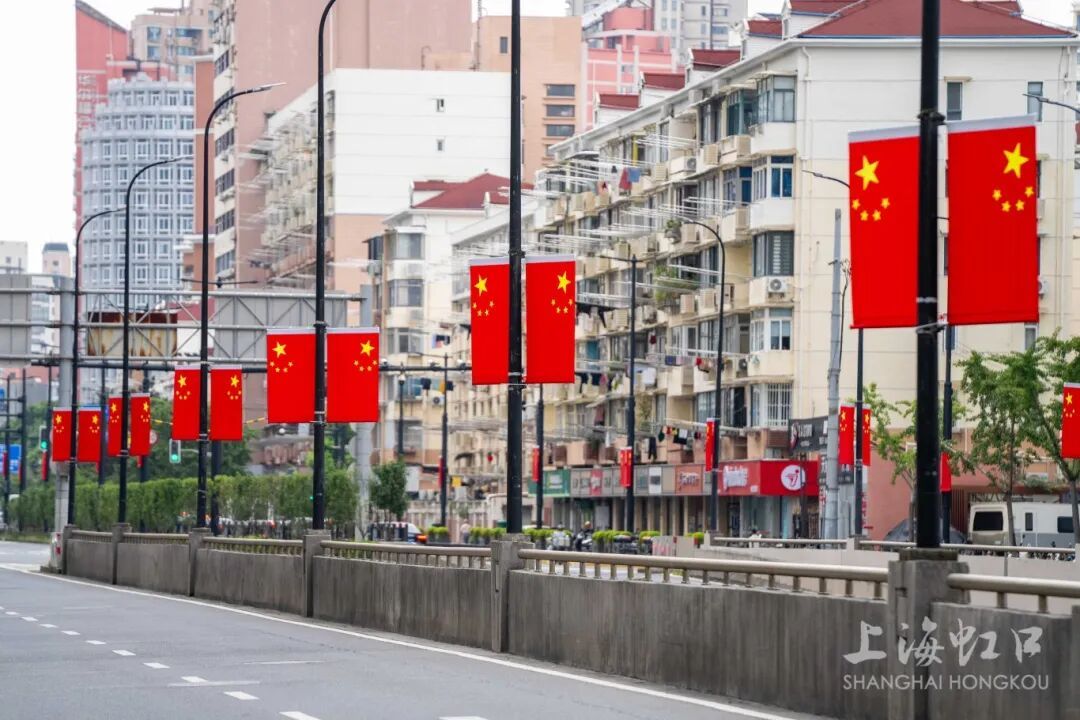国庆期间,“五星红旗进万家”活动又来到了虹口市民的身边。虹口的每一处角落都飘扬着耀眼的中国红。商铺门前国旗高扬,路边灯杆上红旗串联,社区的公共长廊、单元门口亦缀满飘扬的五星红旗,每一面旗帜都承载着对祖国的深情,将节日的喜悦洒满街头巷尾。