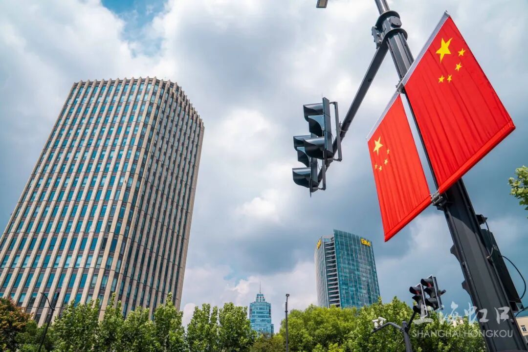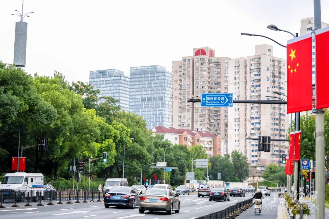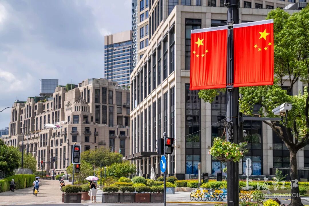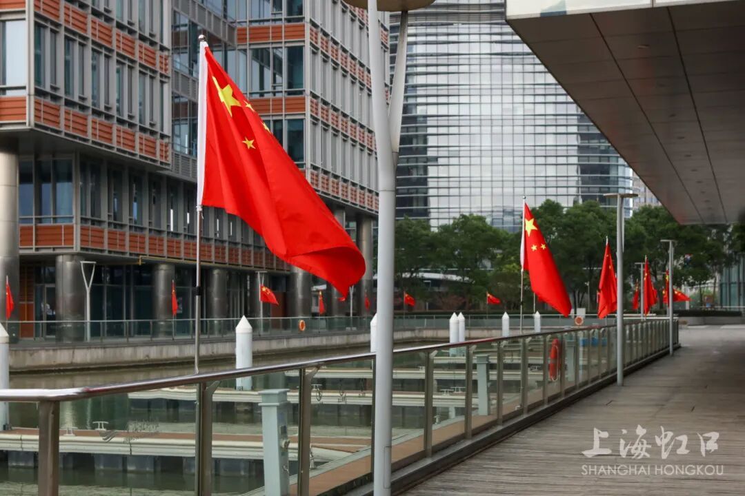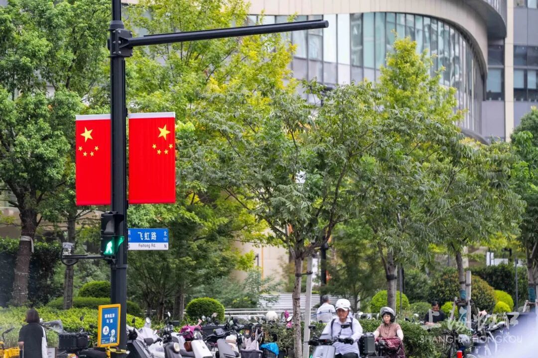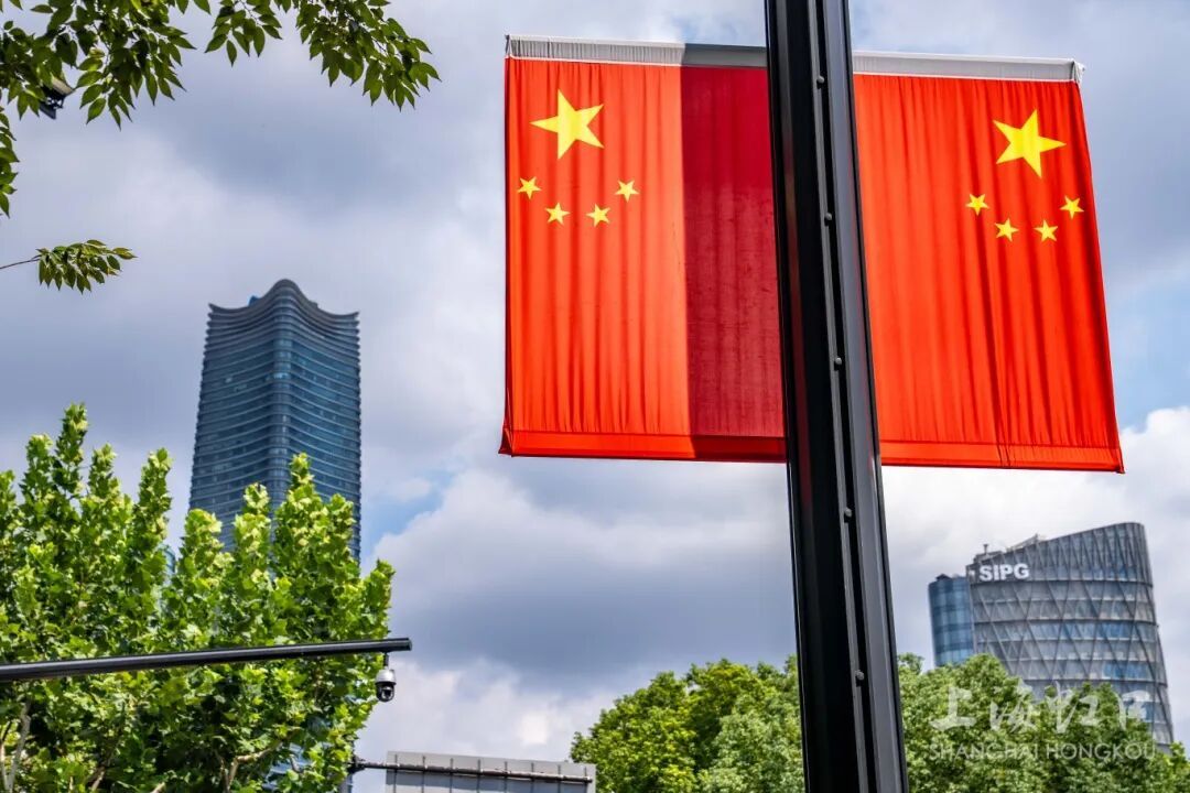 国庆期间,“五星红旗进万家”活动又来到了虹口市民的身边。虹口的每一处角落都飘扬着耀眼的中国红。商铺门前国旗高扬,路边灯杆上红旗串联,社区的公共长廊、单元门口亦缀满飘扬的五星红旗,每一面旗帜都承载着对祖国的深情,将节日的喜悦洒满街头巷尾。