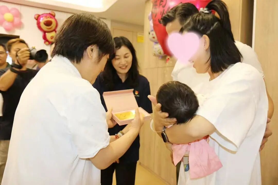 满月活动现场,普陀区妇婴保健院党总支书记与上海造币有限公司市场开发党支部书记向Zoey小朋友送上了一份特别的礼物——首枚由普妇婴与上币公司联合打造的宝宝出生纪念金箔。