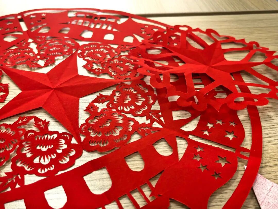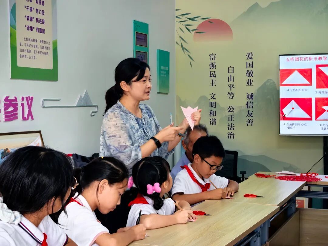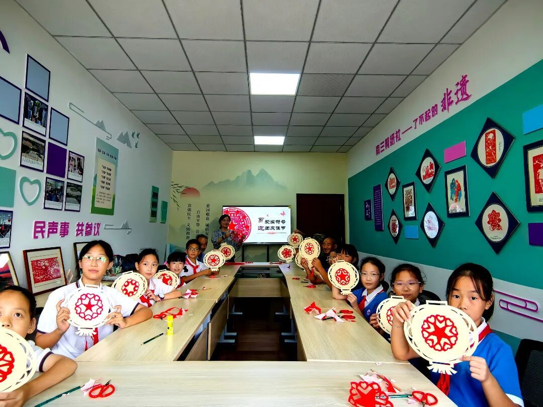 孩子们人手一把剪刀、一叠红纸,跃跃欲试,张玲却道:“要剪好五角红星,折纸是关键。”在“师傅”的示范下,“学徒”们尝试通过五折团花法打样。设计过程中,除了基础图案五角星,不少人还添加了爱心等元素。小小的活动室里,红纸铺展,剪刀翻飞,一番折叠剪裁后,承载着祝福的红星剪纸作品次第出炉。四(3)班学生朱语彤兴奋地举起作品向老师炫耀:“老师、老师,我的国庆主题剪纸完成啦!”