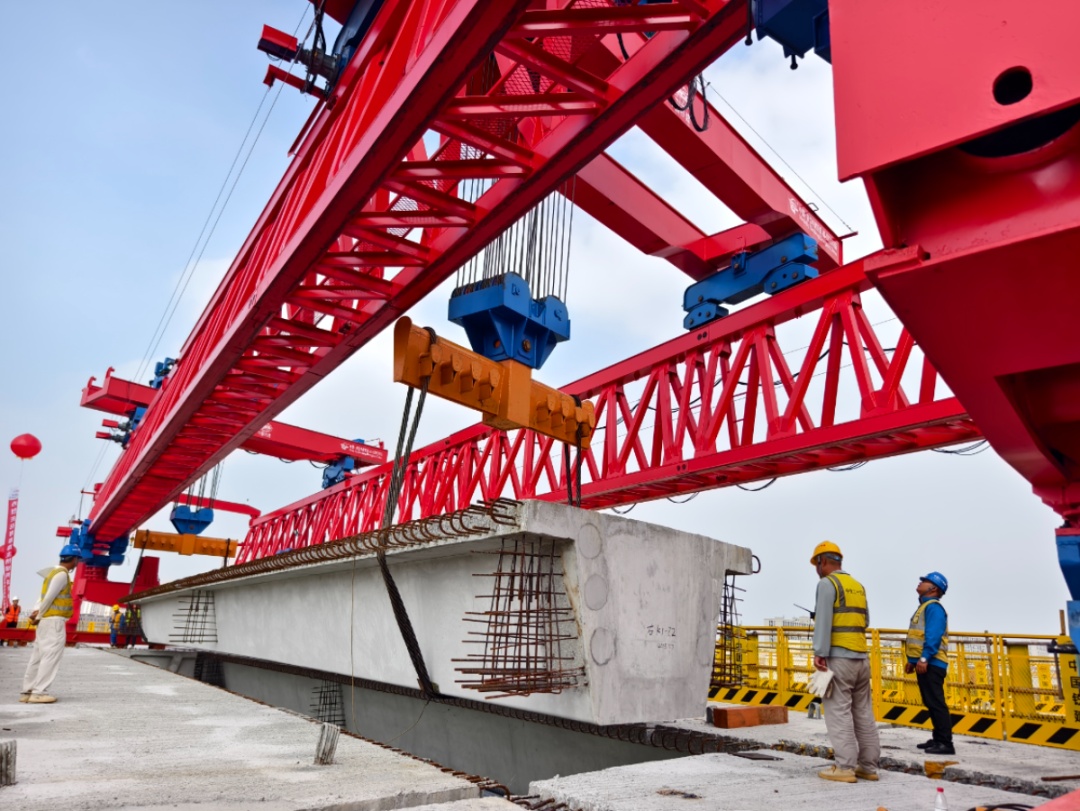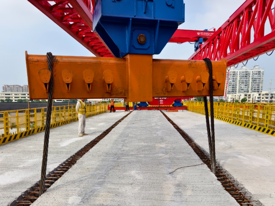 当天下午2点15分,南陈路跨线桥施工现场下达了吊装最后一根箱梁的命令。随着架桥机缓缓调整到位,一根长28米、宽3.9米、重120吨的钢筋混凝土箱梁被从容吊起并移动到位,然后缓缓降落精准合龙,实现了南陈路拓宽改建工程的结构贯通。这一刻,南陈路上“一桥飞架南北”的梦想也将在几个月之后全面实现,这一地区的市民出行条件也将得到显著提升。