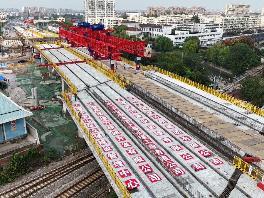 中铁二十四局集团上海铁建工程有限公司南陈路一标项目相关负责人表示:“这个项目主要的特点,就是临近铁路施工,在铁路这里施工的难度还是比较大的。五月份中储物流拆迁之后,及时进场,在东华公司(铁路代建方)和宝山区业主的大力支持下,施工所涉及的铁路交通临时封闭成功,利用铁路火车两次通车之间很短的间隙把架梁完成了。”