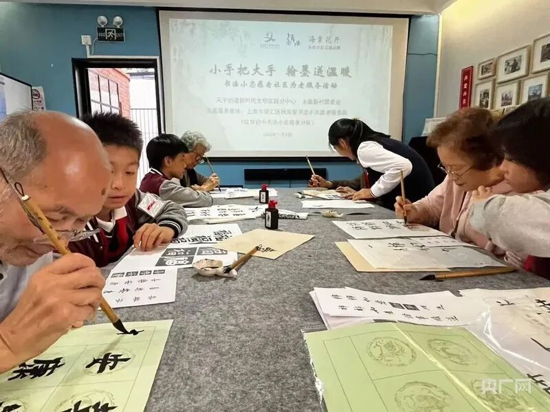 来自上海市位育初中的学生耐心教导爷爷奶奶写毛笔字(央广网发 上海市徐汇区供图)