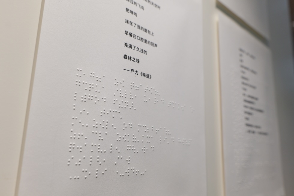 诗中有画,画中有诗——值得注意的是,展览汇集了著名诗人、散文家、书法家赵丽宏诗稿,著名画家乐震文等创作者的多元艺术表达,构建一场跨媒介对话,将艺术潜移默化的力量融入公众生活,助推社区心理建设。赵丽宏说:“当下,诗歌是一种很小众的东西,只有很少人在写诗。希望本次展览通过文字、图像、听觉,让诗歌得到更多人的关注。” 乐震文则对展览中以盲文表现出的诗歌印象深刻:“文字是可以摸出来的。”