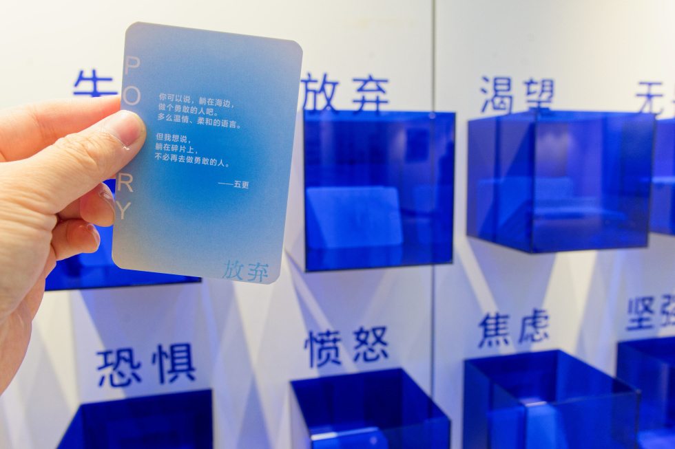 以“诗愈力”为主题,本次展览打破传统诗画展的静态陈列方式,通过“观察—接纳—释放”的动线设计,引导公众完成一场内在探索的旅程。上海市作家协会诗歌专业委员会副主任杨绣丽表示,展览将诗歌从文本转化为空间语言,使文学力量融入公众日常,是诗歌社会功能的一次创新延伸。