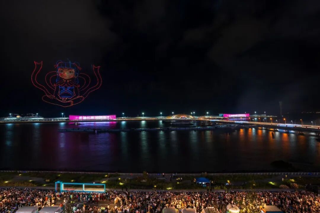 上海国际邮轮旅游度假区吉祥物“阿宝一家” 拉开了吴淞口空中剧场的帷幕 “哪吒”的身影在吴淞口空中剧场跃然天际 混天绫在他身前舞动如炽热的火焰