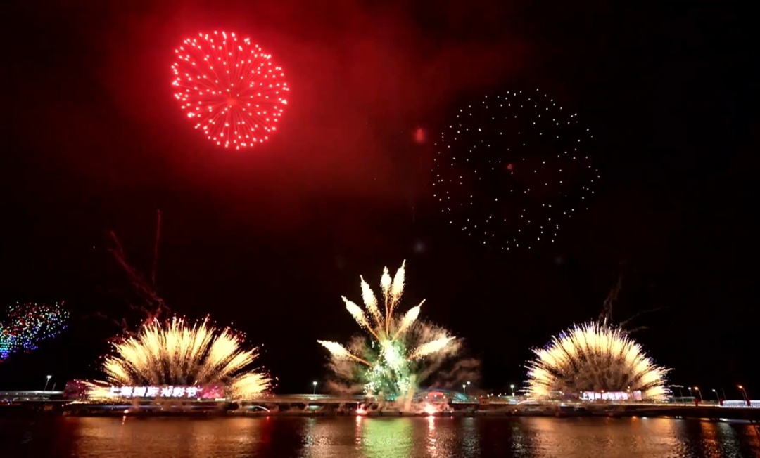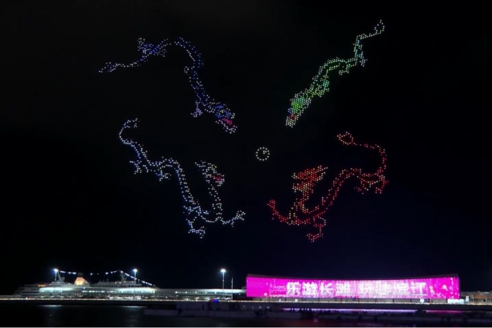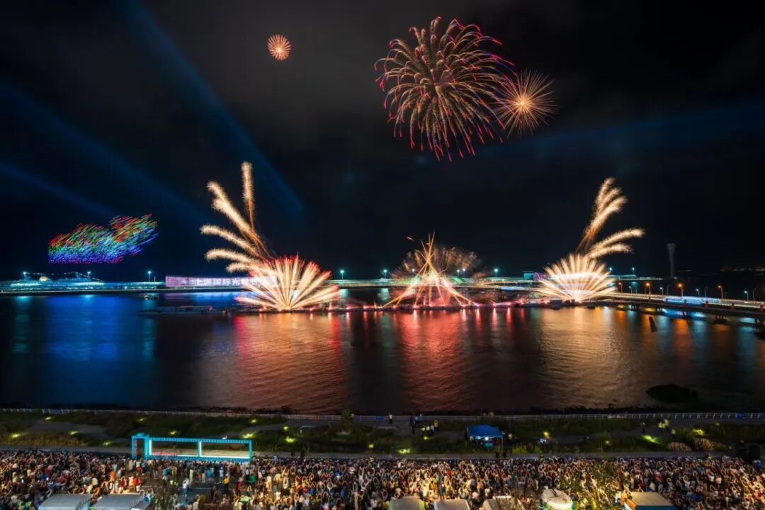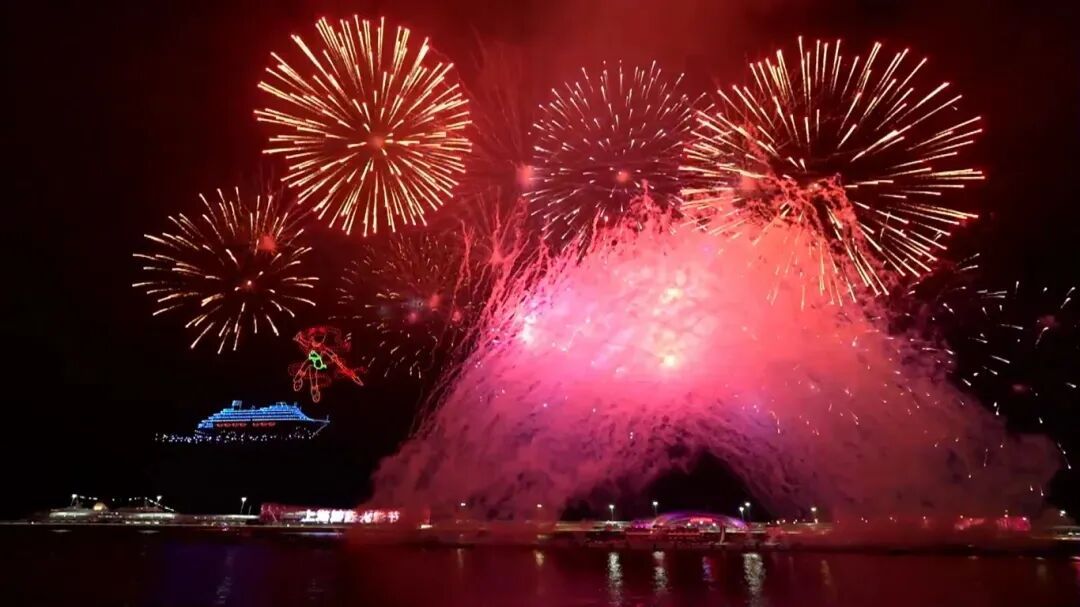 一朵巨大的宝莲缓缓绽放 刹那间,哪吒降世 “他”伸着懒腰从莲台出世 周身萦绕仙气与祥瑞霞光 粉嫩小脸满是灵动朝气 象征着新生命的活力与希望 哪吒脚踩风火轮、手拿火尖枪 与吴淞口的邮轮隔空“相遇” 传统神话与现代工业文明 在这璀璨的夜色下和谐同框 四海龙王也登场! 舒展着威严而又祥和的身姿 中间那颗光芒四射的龙珠 正是一切祥瑞的源泉 哪吒的混天绫化作跃动的音符 温柔地环绕着长滩音乐厅 光影随着音乐的节奏律动 建筑被赋予了生命 致敬这座城市无与伦比的文化魅力 赤绫翻涌间 当剧情推进至“闹海”高潮 精心编排的烟花表演适时加入 璀璨的烟花如星雨垂落、银瀑飞泻 与空中灵动穿梭的“哪吒” 模拟出翻江倒海、电闪雷鸣的激烈战斗场面 无人机的精美灯光 烟花的震撼爆破 音乐的跌宕起伏 交相辉映 共同营造出沉浸式的叙事体验 现场观众赞叹连连