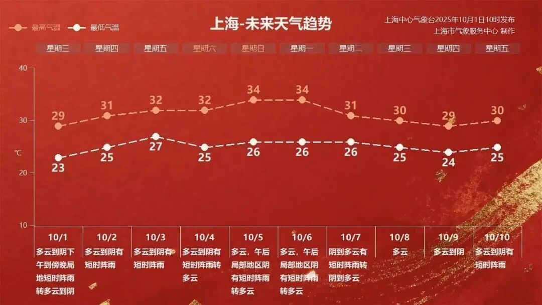 上海中心气象台预计,国庆中秋假期期间申城雨水总体较弱,偶有短时阵雨,基本不影响出行。气温先升后降,随着副高加强,明天的最高气温将上升至31℃,5—6日的最高气温可达34℃,暑气未消,外出注意防暑。假期收尾时,受弱冷空气影响,最高气温降至30℃左右,还请市民们关注临近天气预报,做好生活及出行安排。