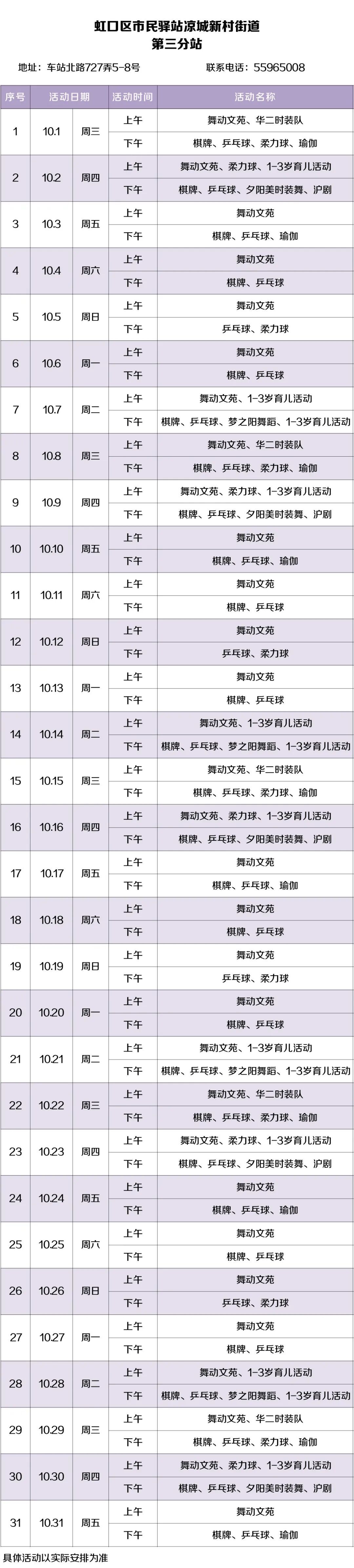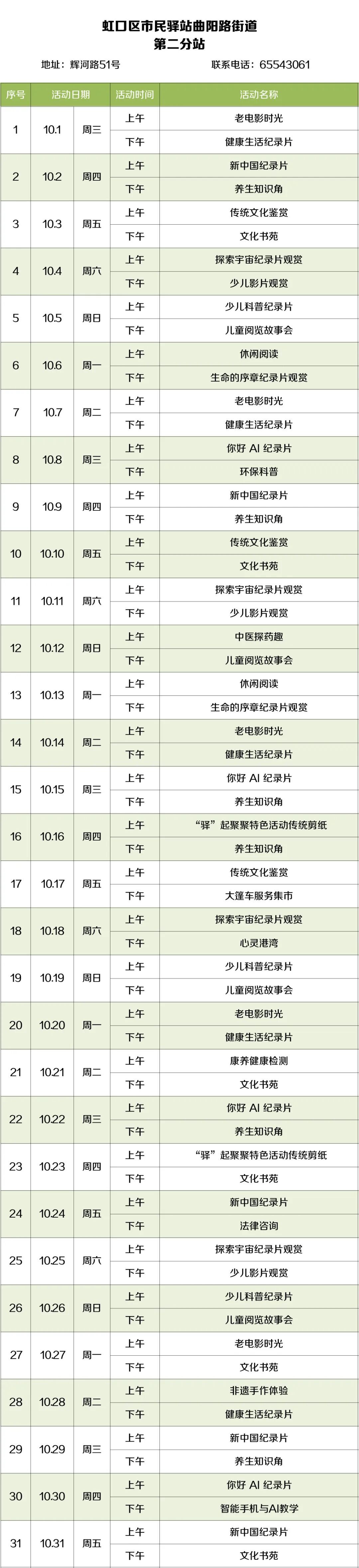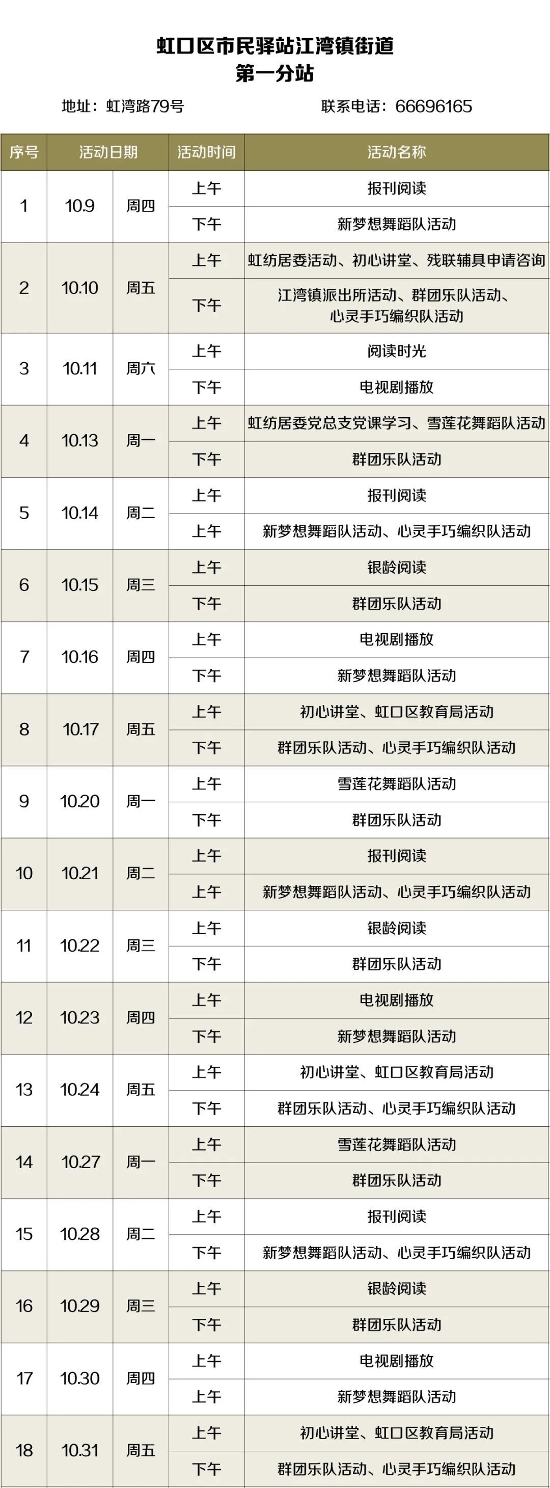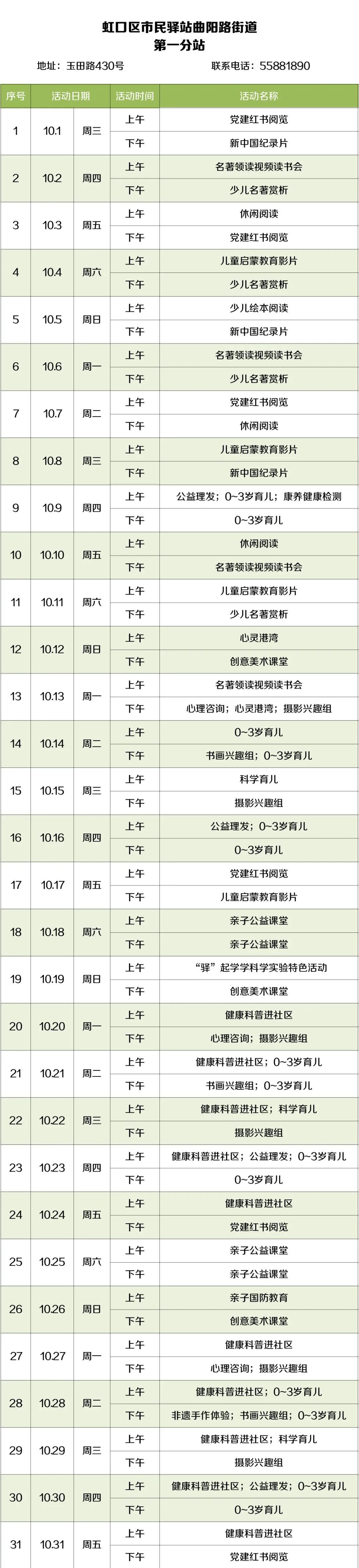 十月来啦!在国庆节和中秋佳节到来的日子,虹口的市民驿站都安排了哪些活动呢?为了让广大居民朋友能提前规划、充分参与,小虹为大家送上虹口各市民驿站十月的活动安排,快来瞧瞧家门口的市民驿站都准备了哪些丰富多彩的活动~