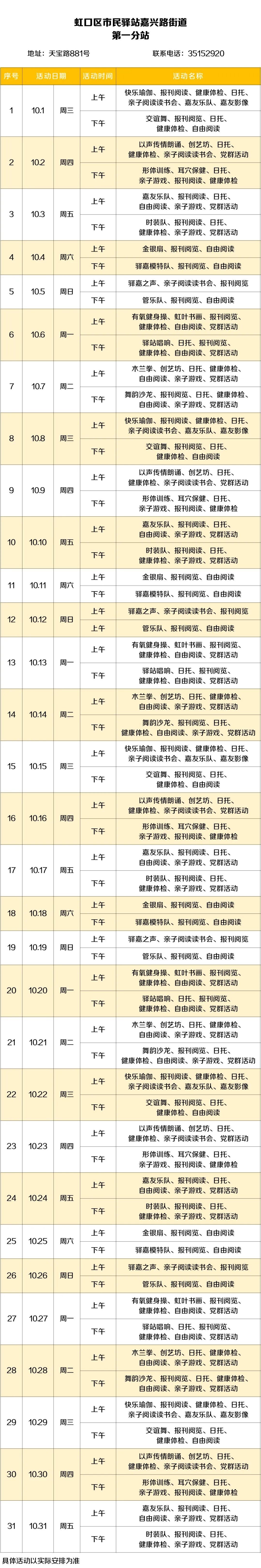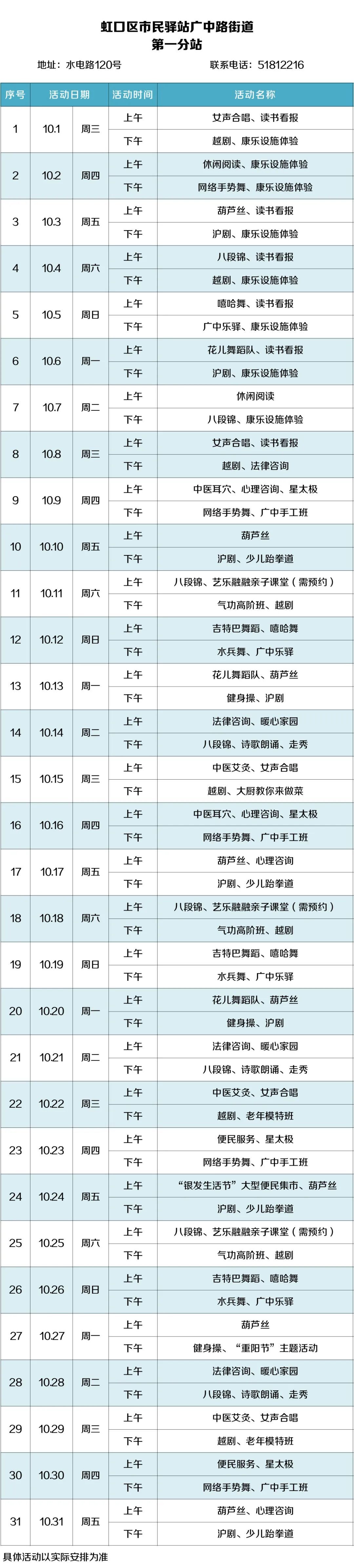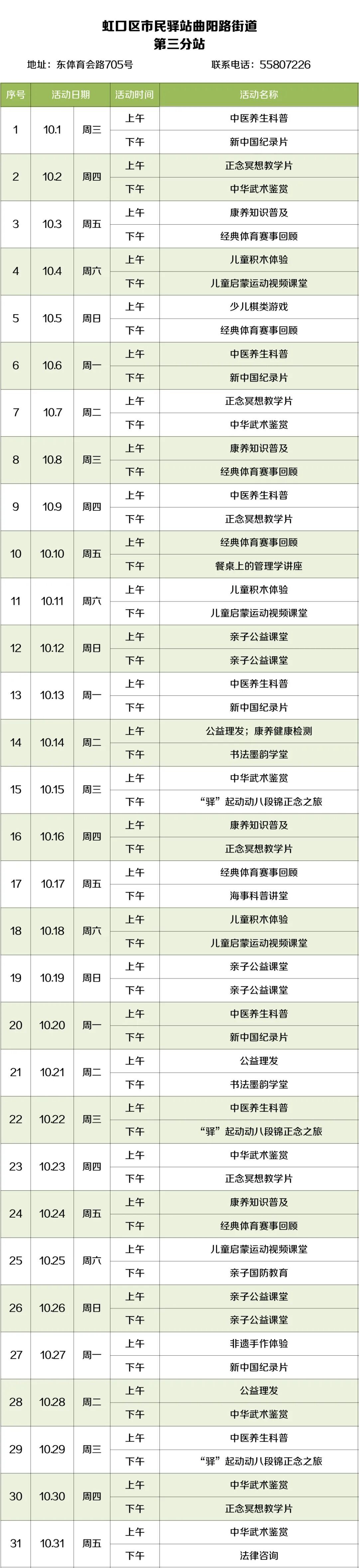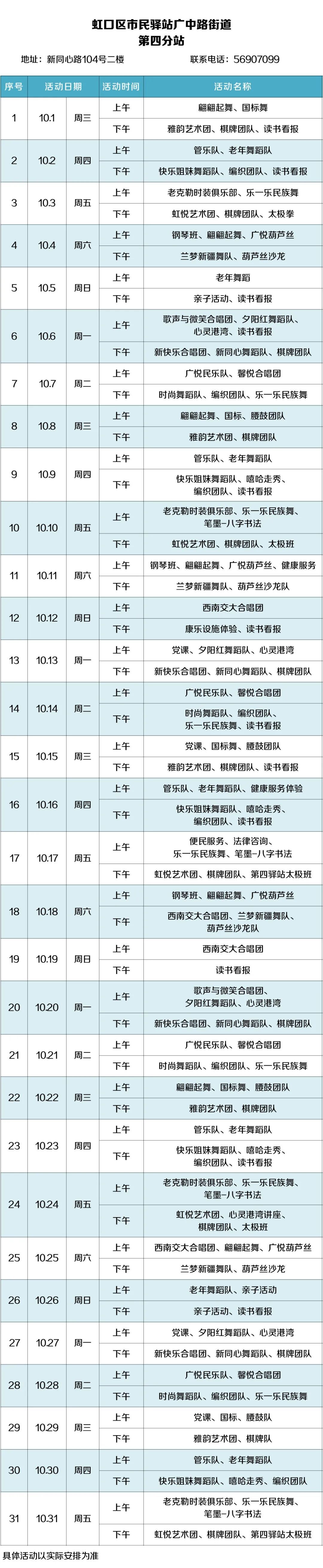 十月来啦!在国庆节和中秋佳节到来的日子,虹口的市民驿站都安排了哪些活动呢?为了让广大居民朋友能提前规划、充分参与,小虹为大家送上虹口各市民驿站十月的活动安排,快来瞧瞧家门口的市民驿站都准备了哪些丰富多彩的活动~