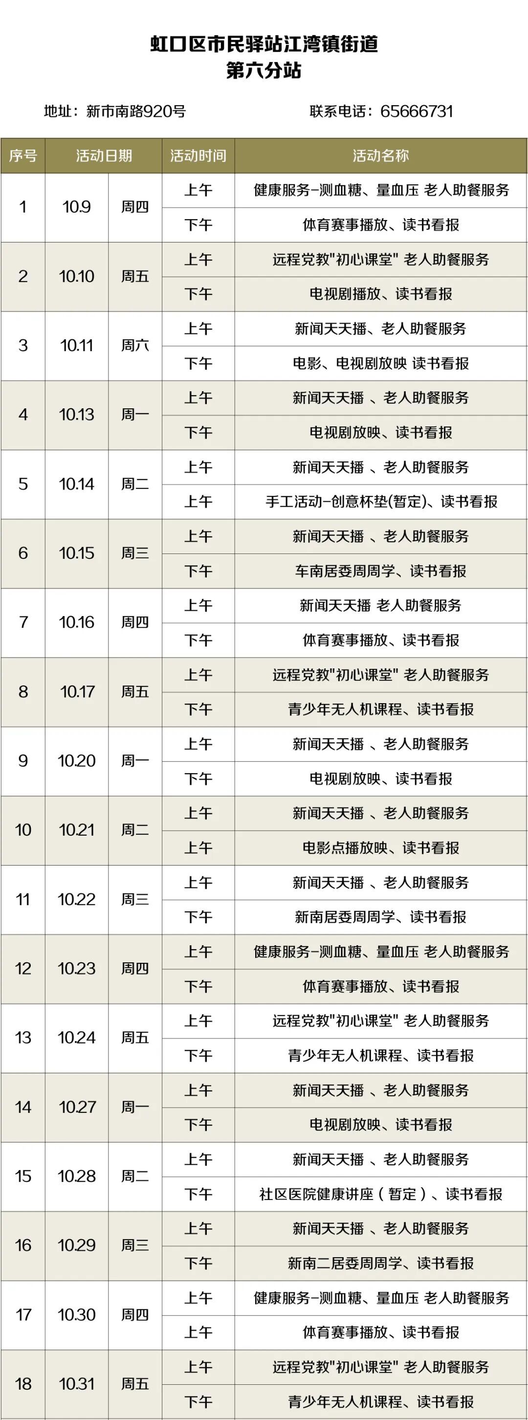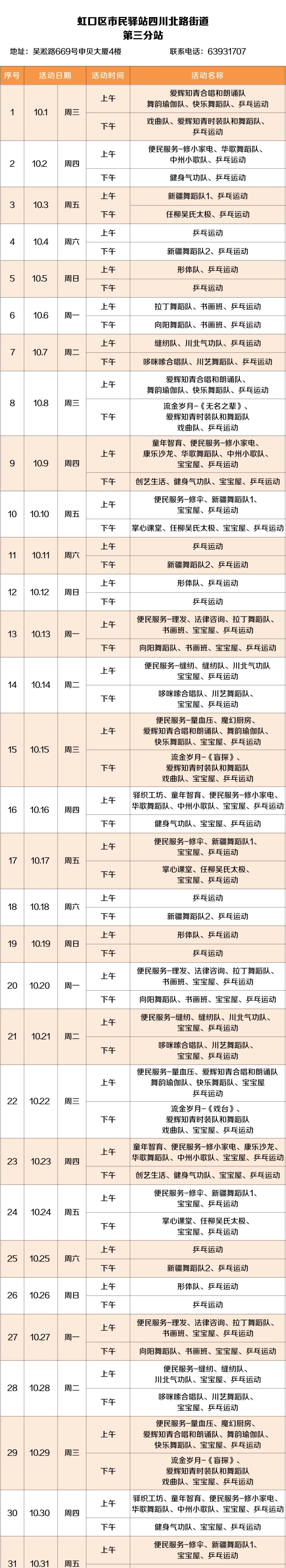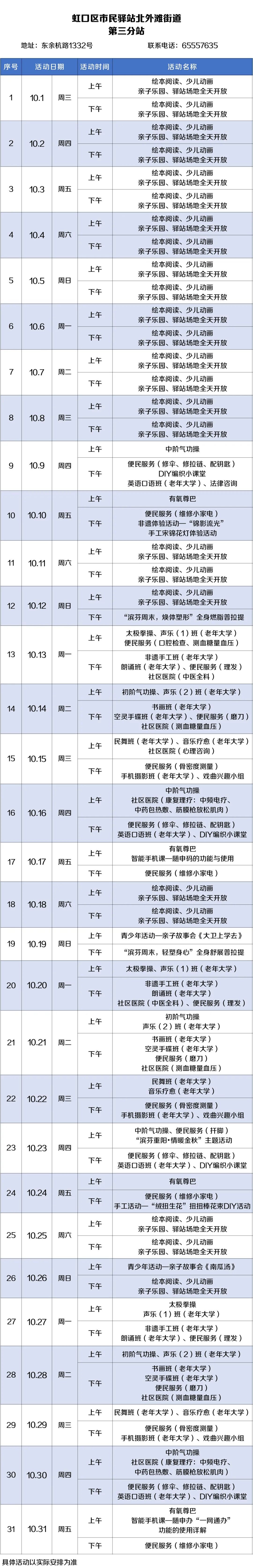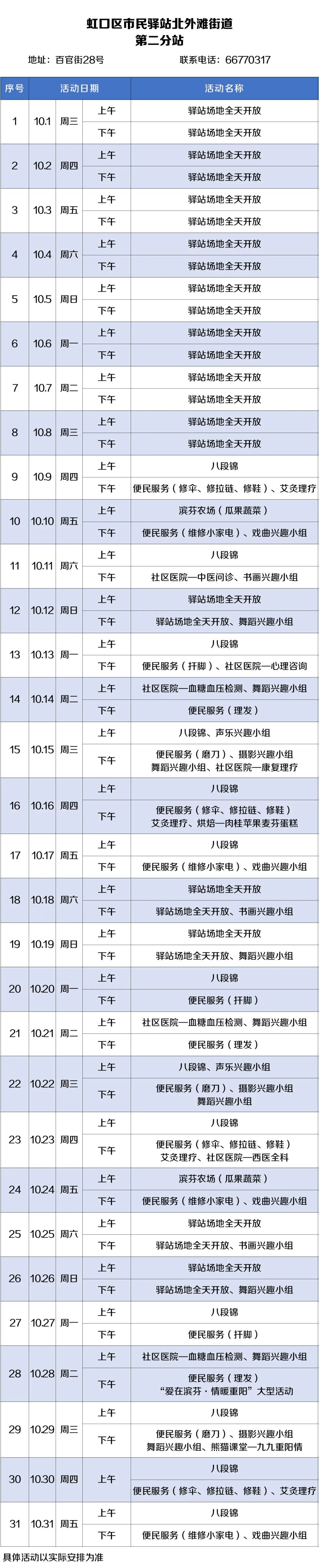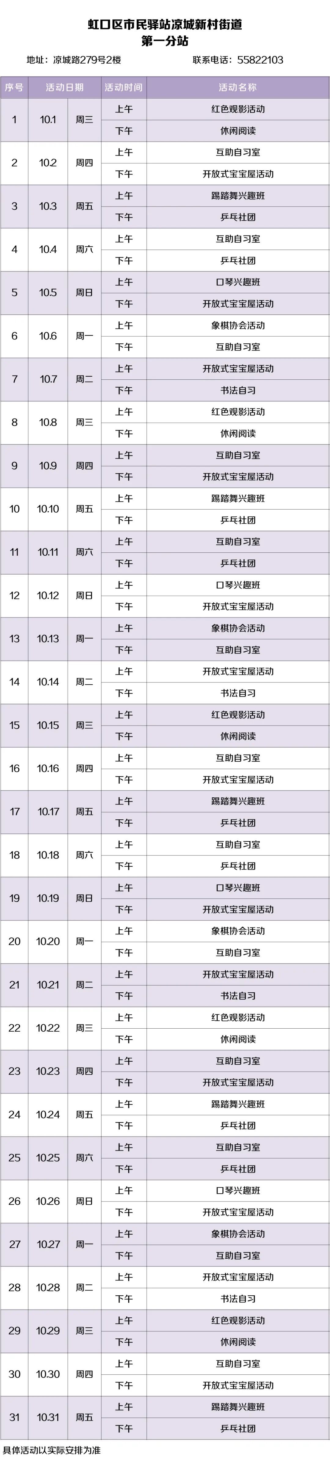 十月来啦!在国庆节和中秋佳节到来的日子,虹口的市民驿站都安排了哪些活动呢?为了让广大居民朋友能提前规划、充分参与,小虹为大家送上虹口各市民驿站十月的活动安排,快来瞧瞧家门口的市民驿站都准备了哪些丰富多彩的活动~