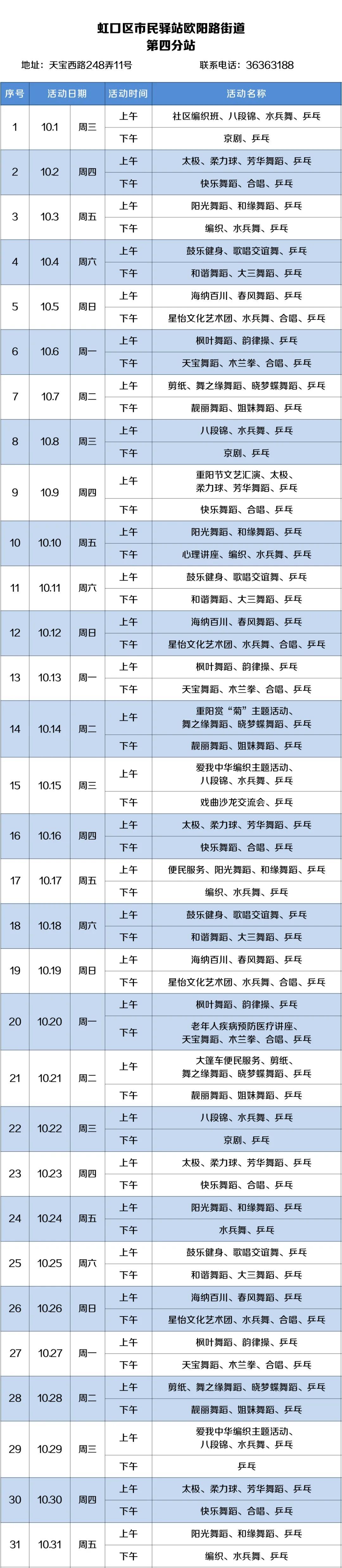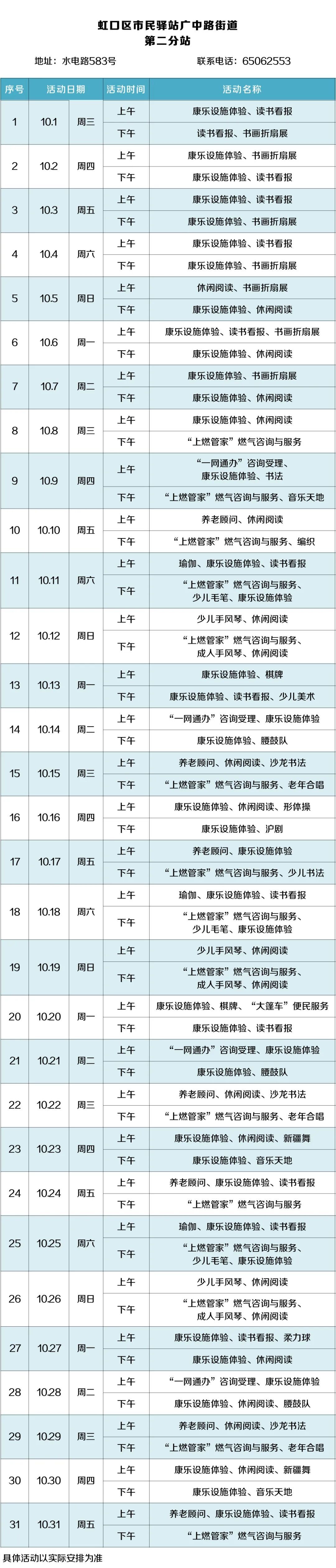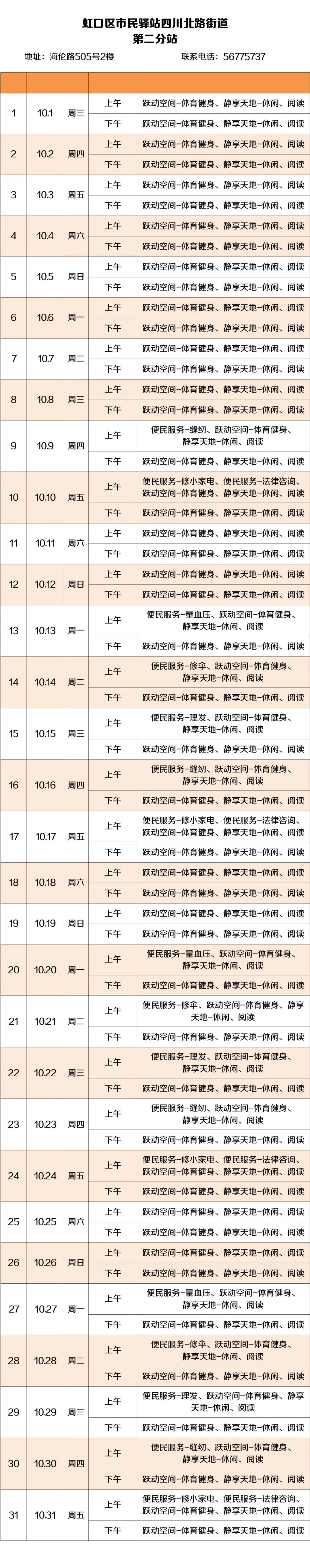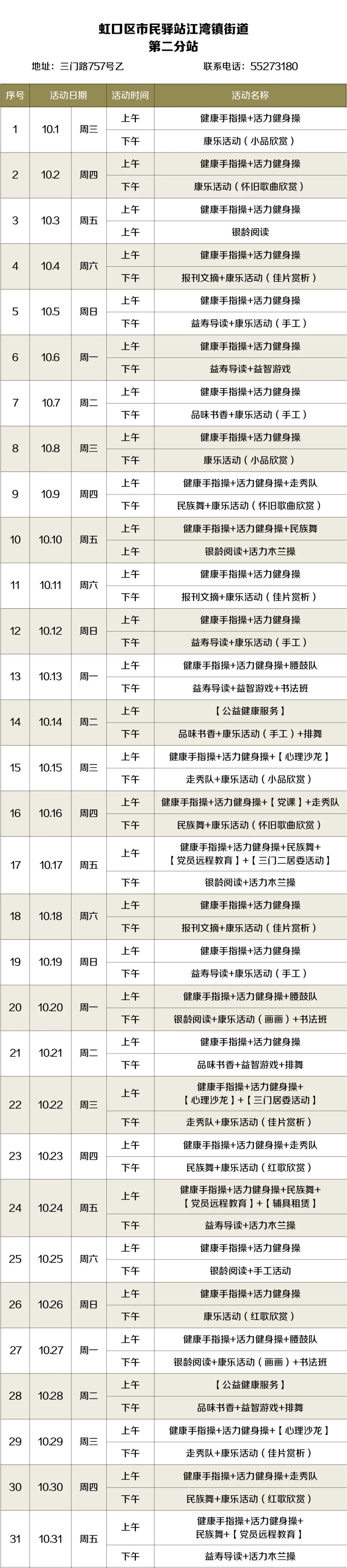 十月来啦!在国庆节和中秋佳节到来的日子,虹口的市民驿站都安排了哪些活动呢?为了让广大居民朋友能提前规划、充分参与,小虹为大家送上虹口各市民驿站十月的活动安排,快来瞧瞧家门口的市民驿站都准备了哪些丰富多彩的活动~