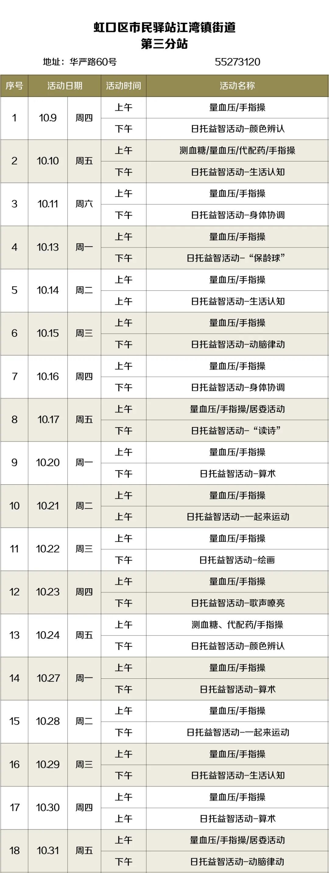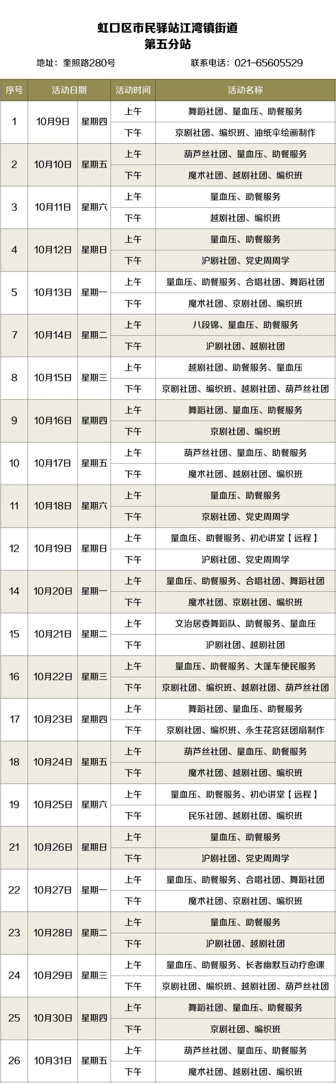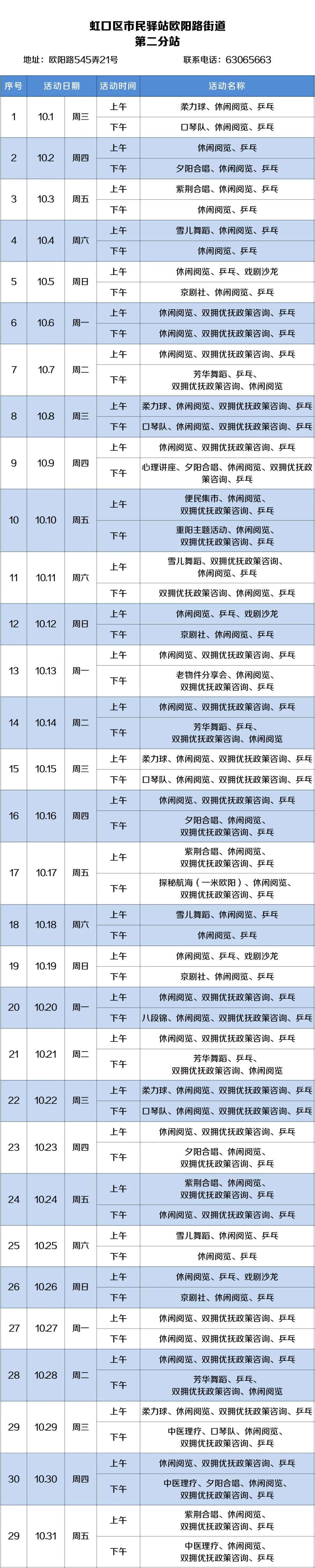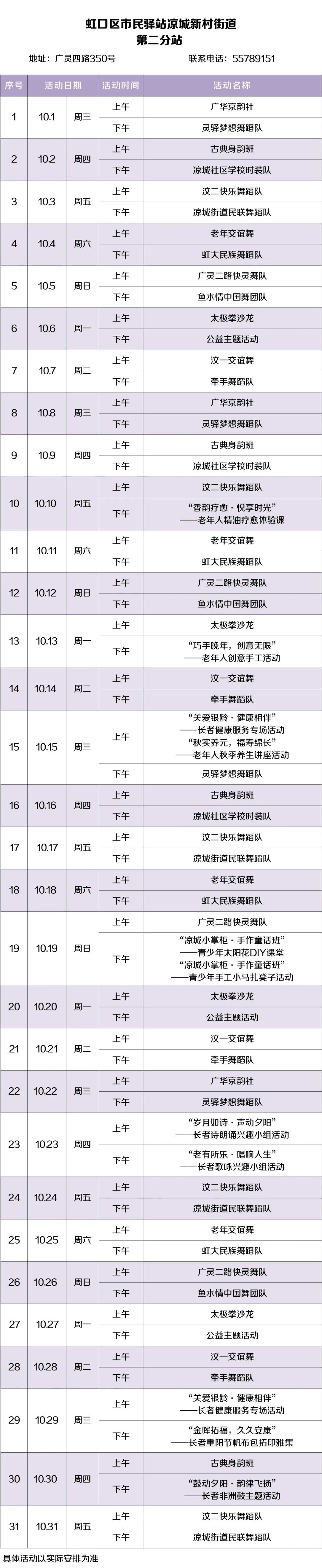 十月来啦!在国庆节和中秋佳节到来的日子,虹口的市民驿站都安排了哪些活动呢?为了让广大居民朋友能提前规划、充分参与,小虹为大家送上虹口各市民驿站十月的活动安排,快来瞧瞧家门口的市民驿站都准备了哪些丰富多彩的活动~