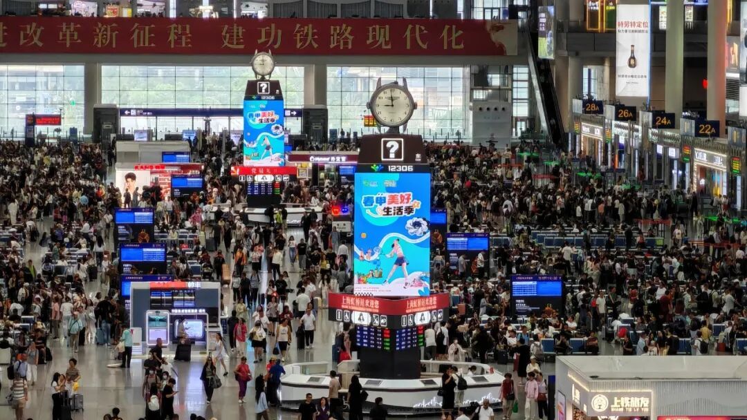 中午12时的上海虹桥站,来往旅客人山人海,这里承载着全上海铁路运输超过一半的客流。今天预计将发送旅客41.1万人次。