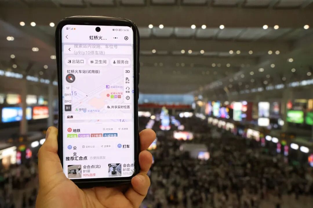 这个假期,站内首次试点“室内导航”服务。您可以在站内各个不同点位,通过扫描上海虹桥站“室内导航”服务(试用版)的二维码,在“随申行”小程序上,实现“一键导航”“车位标记”“共享位置”和“一键查找”等功能服务,现已覆盖地铁、公交、出租车、网约车、停车、长途客车等6个交通场景。同时,为了更好地疏散抵达虹桥的客流,虹桥枢纽交通保障工作也有条不紊地进行。