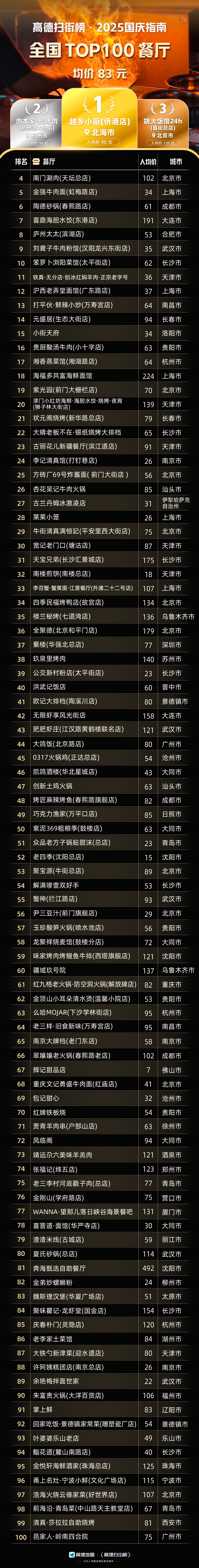 近日,高德扫街榜发布《国庆指南:全国TOP100餐厅》。这是首个全国TOP100餐厅榜单,成为本次长假“很可靠”的美食指南。