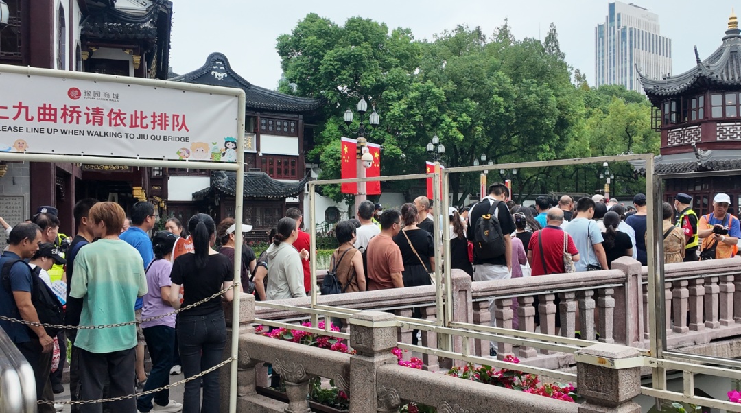 国庆长假首日,申城天气晴好。市中心的豫园,吸引了众多市民游客纷至沓来,瞬间迎来客流高峰。不少人选择在国庆节这个特殊的日子里,漫步于此,走一走九曲桥,品尝一下南翔馒头店闻名遐迩的小笼包,感受节日氛围。