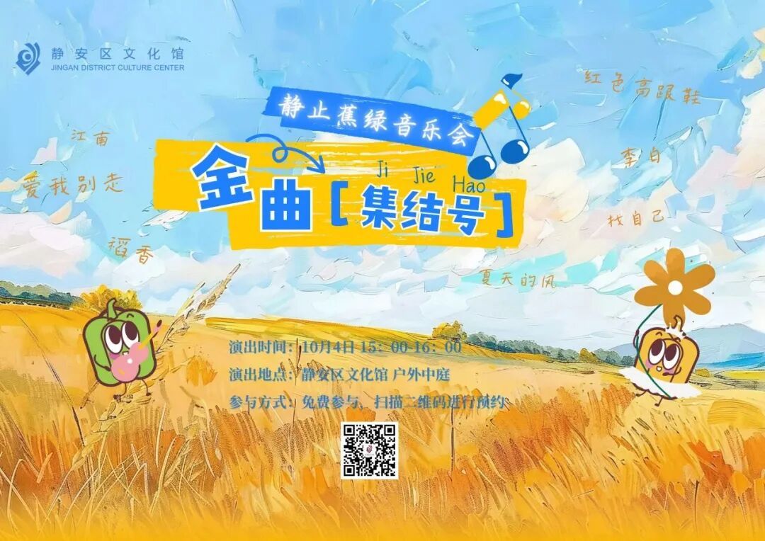 10月4日15:00—16:00,静止蕉绿音乐会——金曲集结号,带你重温当代流行音乐的热门金曲,在经典旋律中感受音乐的魅力。