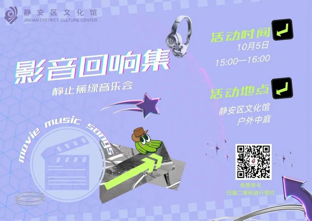 10月5日15:00—16:00,静止蕉绿音乐会——影音回响集,精选多部经典电影的主题曲和配乐,通过现场乐队的精彩演绎,重温那些难忘的银幕时刻。