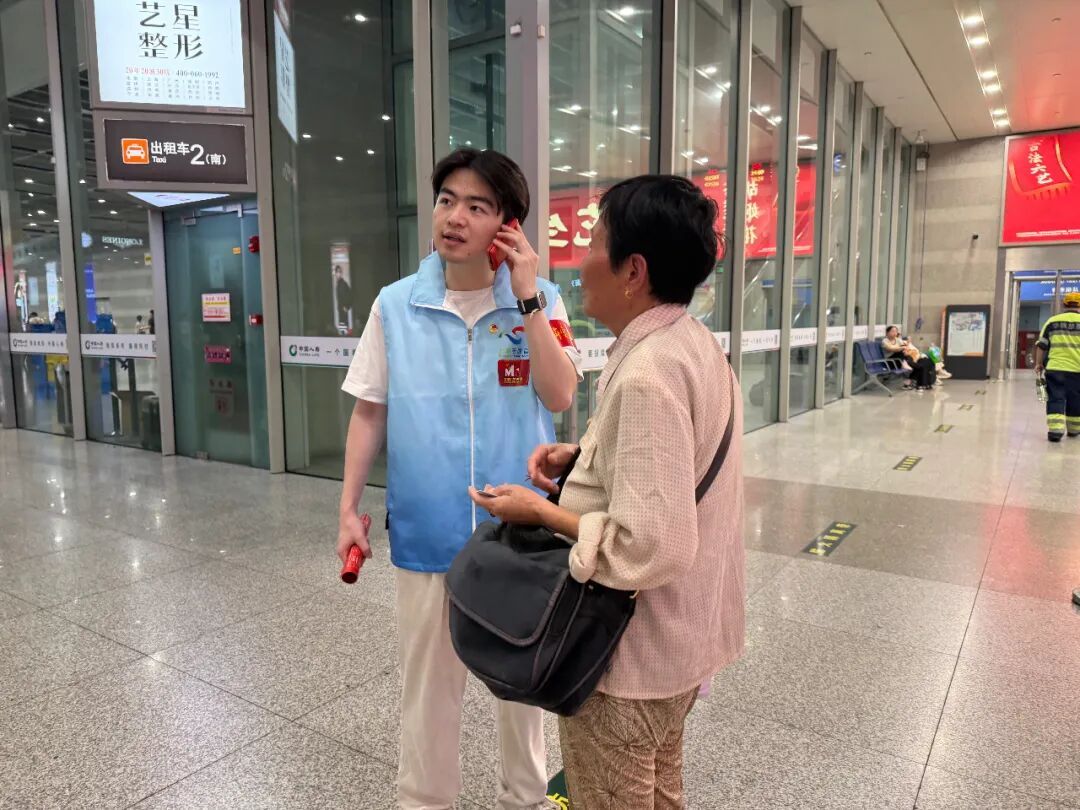 虹桥火车站自助售票机前,一位大爷独自伫立,手里紧攥着一张写有地址的纸条,眼神里满是茫然。团区委青年志愿者——中建科技马鸣泽快步上前、主动帮忙。大爷掏出一张纸条,说道:“同志,我去这个地方,这机器……我不会弄。”那张用钢笔工整书写的纸条,在这个扫码时代显得格外珍贵。马鸣泽接过纸条,一步步帮他操作。他凑得很近,学得认真,嘴里还念着步骤。当成功取出车票时,他紧锁的眉头瞬间舒展。这让马鸣泽认识到:志愿服务不仅仅是指引方向,更是用一份耐心,去回应那些被数字时代困住的需求。