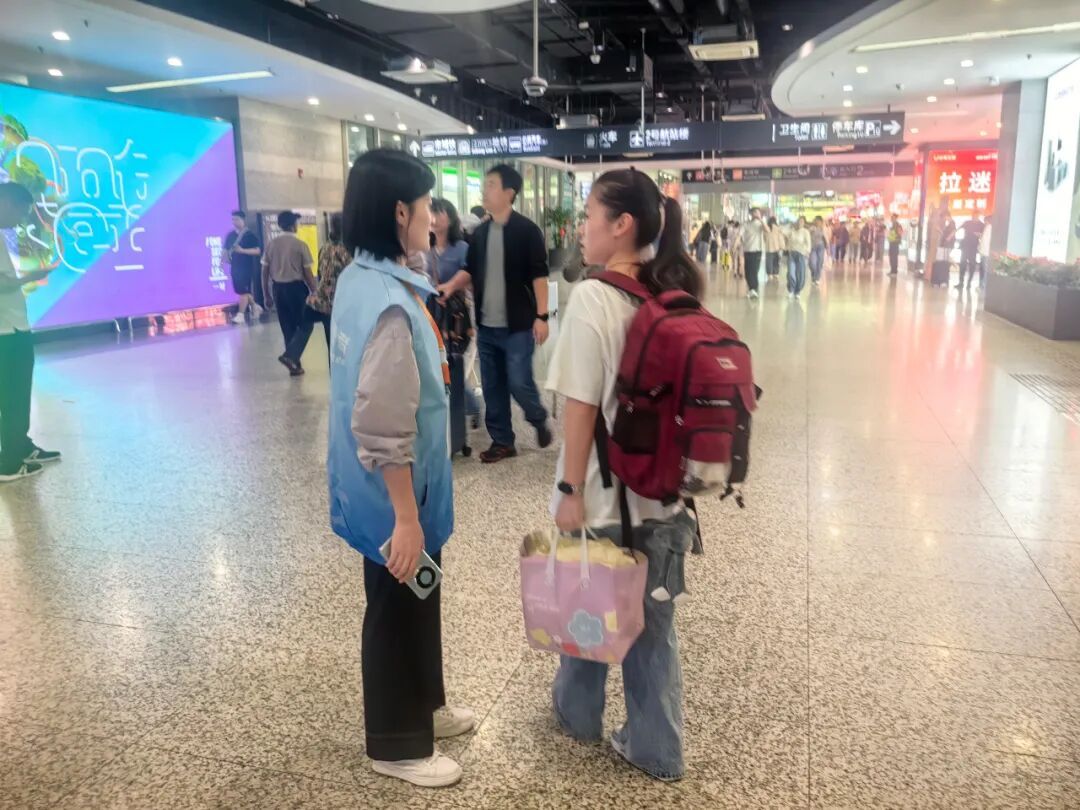 国庆清晨,虹桥枢纽已是人潮涌动。在川流不息的人群中,团区委青年志愿者——农行上海闵行支行的安婷婷正专注地为旅客提供指引。她身旁静立着一个行李箱——那是准备下午返乡的行囊,此刻却成了她坚守岗位的见证。服务期间,一位准备前往嘉善南站的阿姨焦急前来求助。面对手机购票界面,她显得有些无措。安婷婷立即上前安抚,随后放慢语速,一步步引导阿姨选择车次、确认座位,仔细核对信息。当支付成功的界面亮起,车票信息跃入眼帘时,阿姨终于松了口气,紧紧握住安婷婷的手连声道谢。