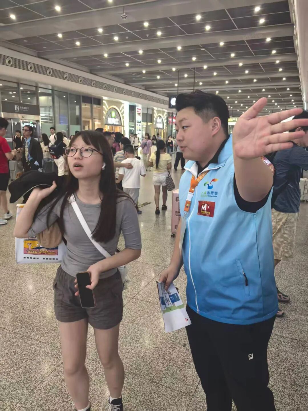 10月1日上午,虹桥火车站内人流如织。团区委青年志愿者——民生银行闵行中心支行刘文彰正快步走向服务点位,却在半路被一位小哥“截停”。“小伙子,G1591次列车在哪儿检票?快来不及了!还有20分钟!”对方手中紧攥车票,语气急促,额头上沁着细密的汗珠。刘文彰迅速环顾四周,凭借对车站布局的熟悉,立即指向不远处的扶梯:“从这边上到出发层最快!”然而,眼前的扶梯上人流拥挤,而旅客还提着两个大行李箱。刘文彰主动接过一只箱子,示意对方:“我们走旁边楼梯,避开人流,更快!”两人快步上行,刘文彰一边提醒“前方右转就是B12检票口”,一边安抚道:“时间充裕,您慢慢走,注意安全!”抵达站台层后,旅客终于松了口气,连声道谢,随即汇入前行的人流。