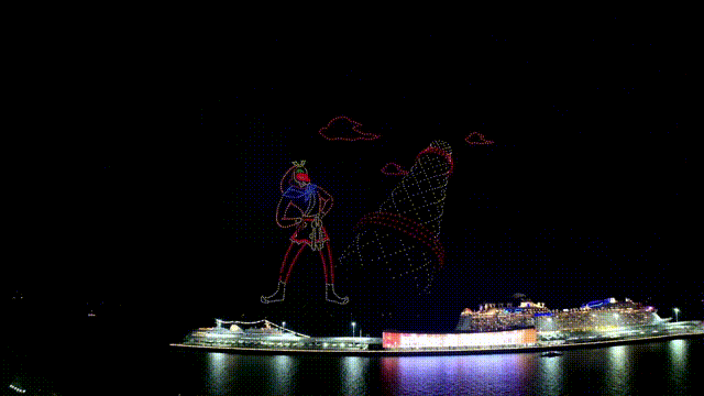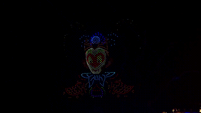 晚上7点30分,这场万众瞩目的无人机光影秀正式开幕,悟空来也!只见无人机群排成的悟空造型形象生动,天宫的蟠桃树果实累累,偶尔腾空而起的烟花烘托了“大闹天宫”的视觉效果,悟空在半空中腾云驾雾,如梦如幻。